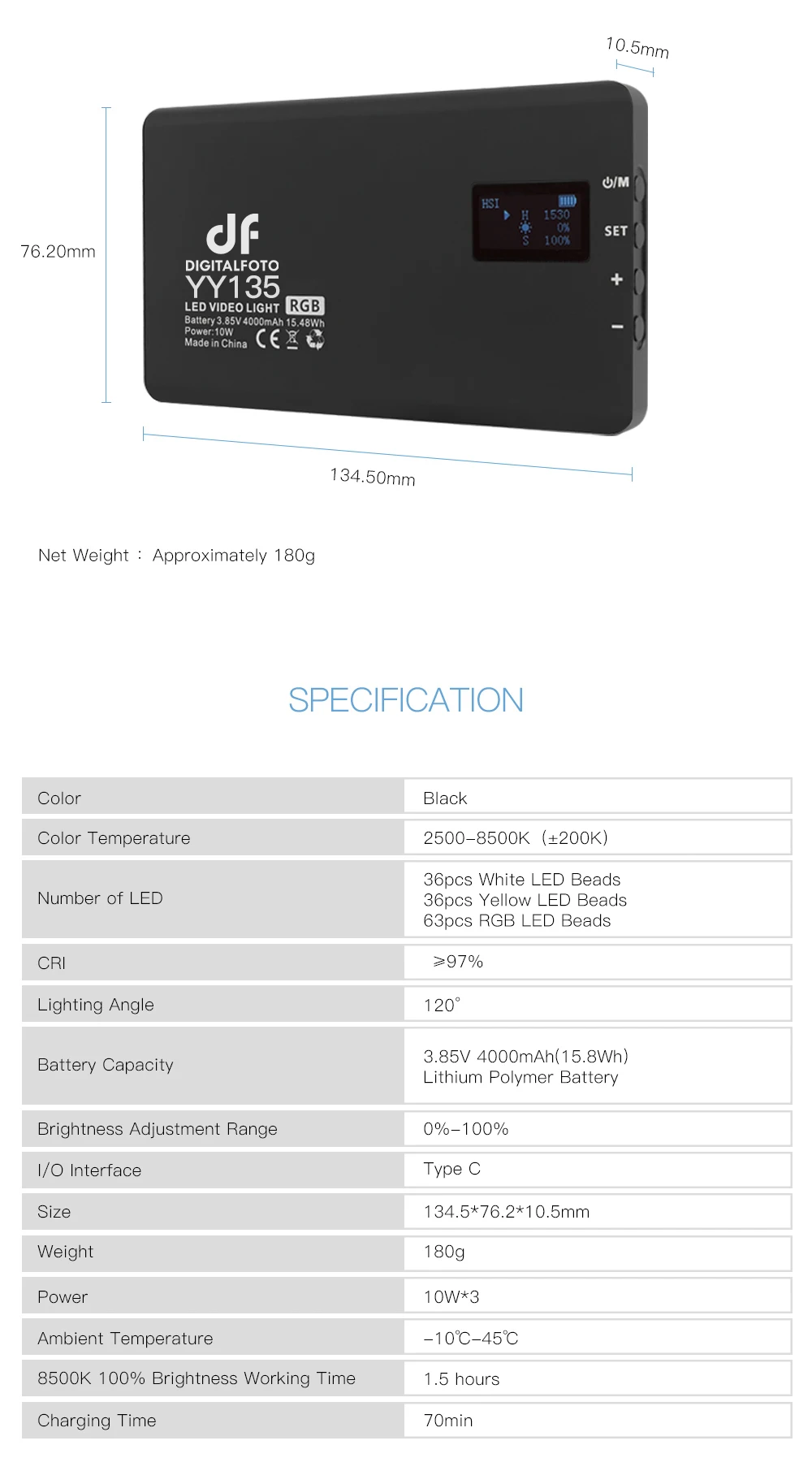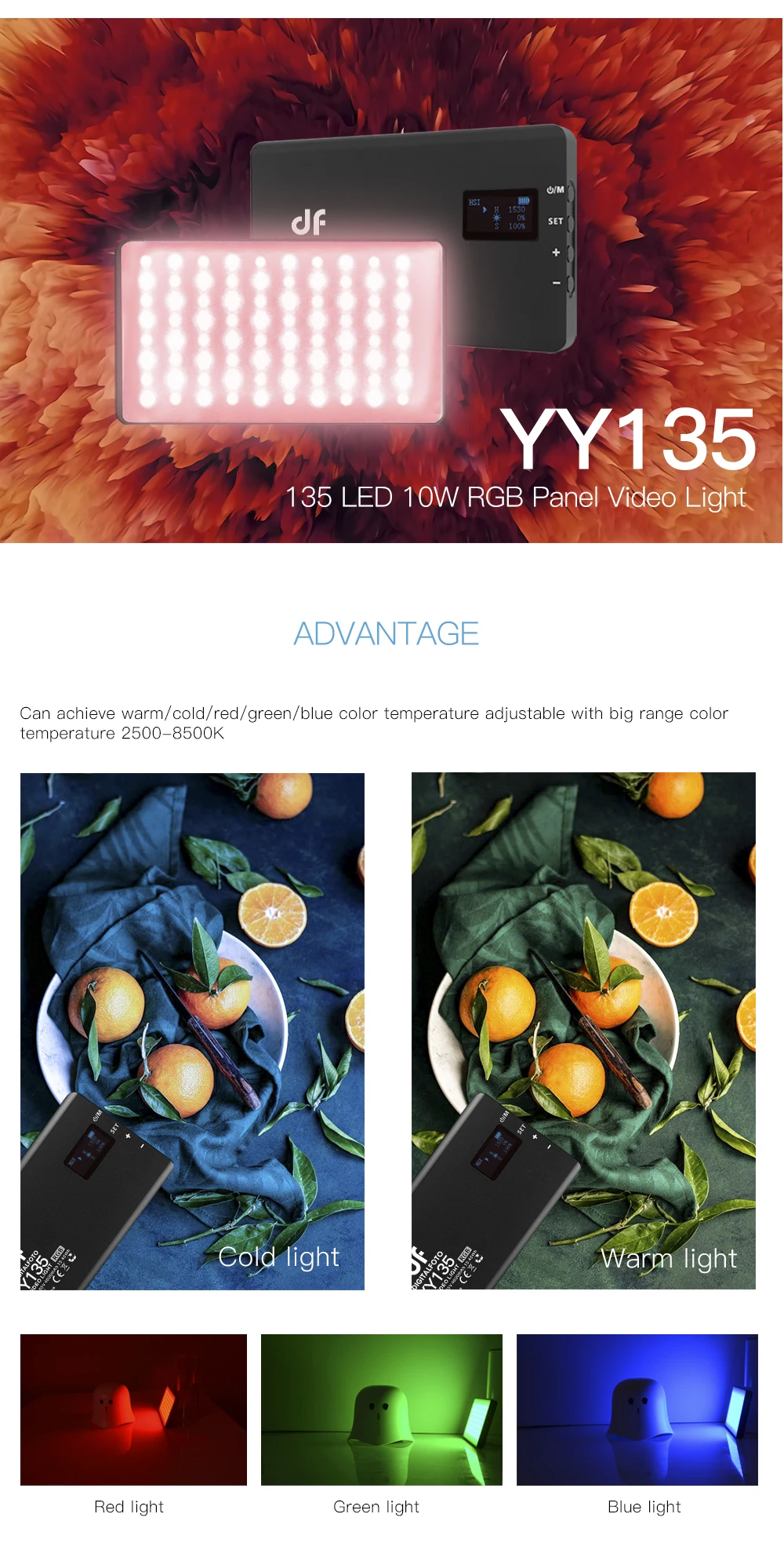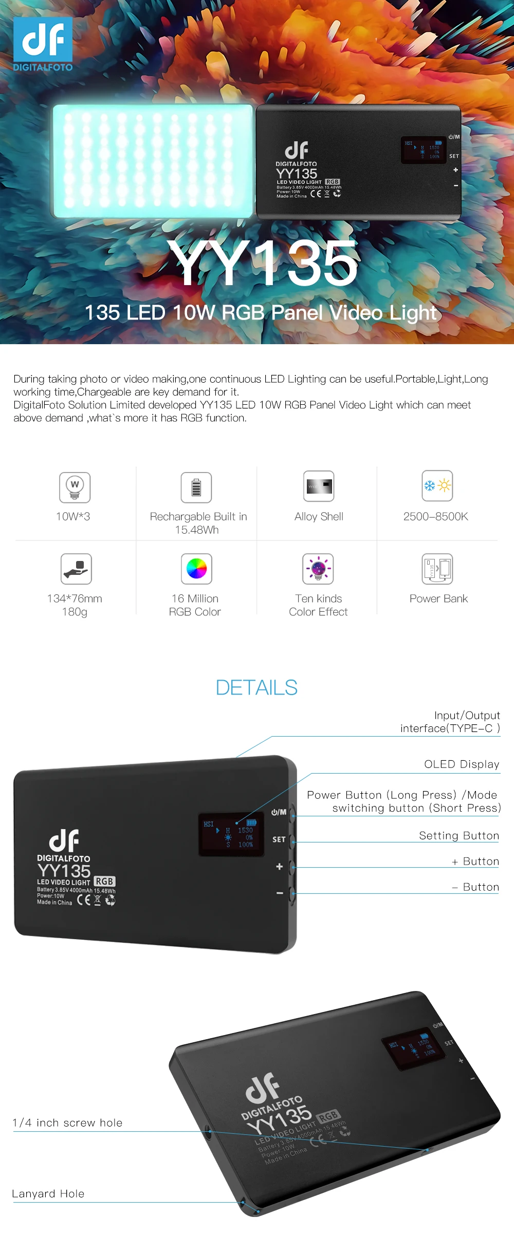 DigitalFoto Solution Limited Разработанный YY135 светодиодный 10W RGB панельный видео светильник, который может удовлетворить вышеуказанные требования, более того, он имеет функцию RGB.
