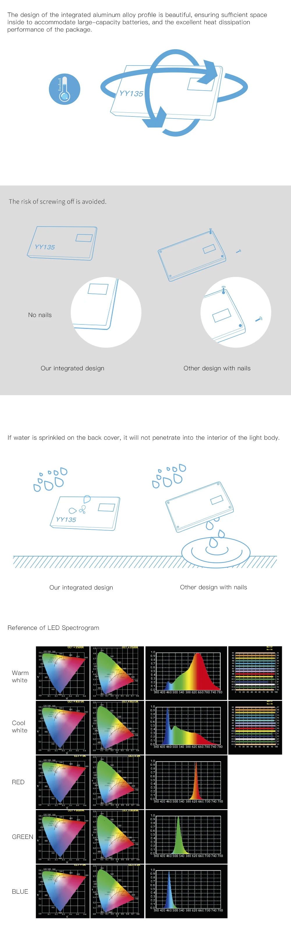 9. Дизайн интегрированного профиля из алюминиевого сплава красив, обеспечивая достаточное пространство внутри для размещения аккумуляторов большой емкости и отличную теплоотдачу посылка. Если вода посыпается на заднюю крышку, она не проникает внутрь корпуса светильник, и избегается риск скручивания.