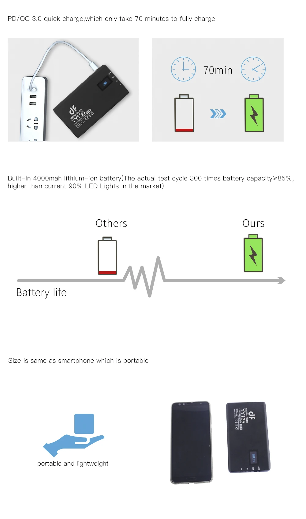 6. Встроенный литий-ионный аккумулятор 4000 мАч (фактический цикл тестирования в 300 раз емкость аккумулятора ≥ 85%, выше, чем текущий светодиодный индикатор 90% на рынке)