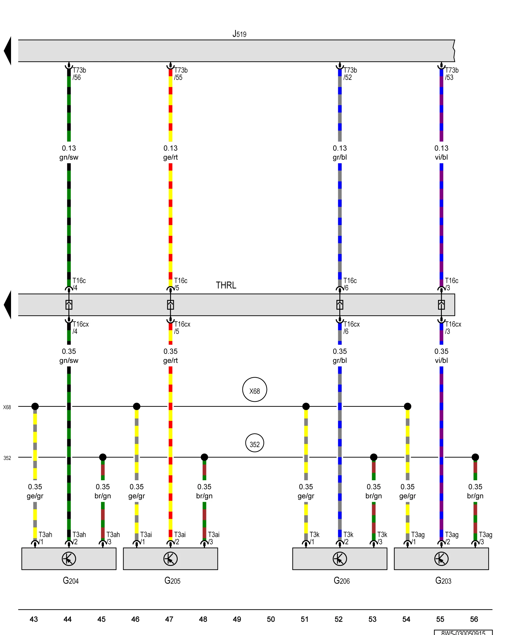 G568-передний левый Отправитель для park assist рулевого управления с левой стороны транспортного средства G569-передний правый Отправитель для помощи парку рулевого управления на правой стороне транспортного средства G716-задний левый парк Помощь рулевого управления отправителя G717-Задний правый парк Помощь рулевого управления отправителя J519-бортовой Контроль Поставок unitA0058W200805 # BTJ519 T3ae-3-контактный разъем для подключения к краю, черный T3af-3-контактный разъем для подключения к краю, черный T3al-3-контактный разъем для подключения к краю, черный T3am-3-контактный разъем для подключения к краю, черный T8d - 8-pin разъем для подключения к краю, черный T8dx - 8-pin разъем для подключения к краю, черный T16c-16-контактный диагностический разъем, коричневый T16cx-16-контактный диагностический разъем, коричневый T73b - 73-контактный разъем для подключения к краю, черный Точка сцепления в багажном отделении, leftA0058W200807 # BTTHRL TSFVL-точка соединения на передней левой стороне bumperA0058W200807 # BTTSFVL 348-подключение к земле (парковочное устройство), жгут проводов переднего бампера 352-подключение к земле (парковочное устройство), жгут проводов заднего бампера X65-подключение (парковочный аппарат), в передний бампер жгут проводов X68-положительное соединение (парковочное устройство), жгут проводов заднего бампера