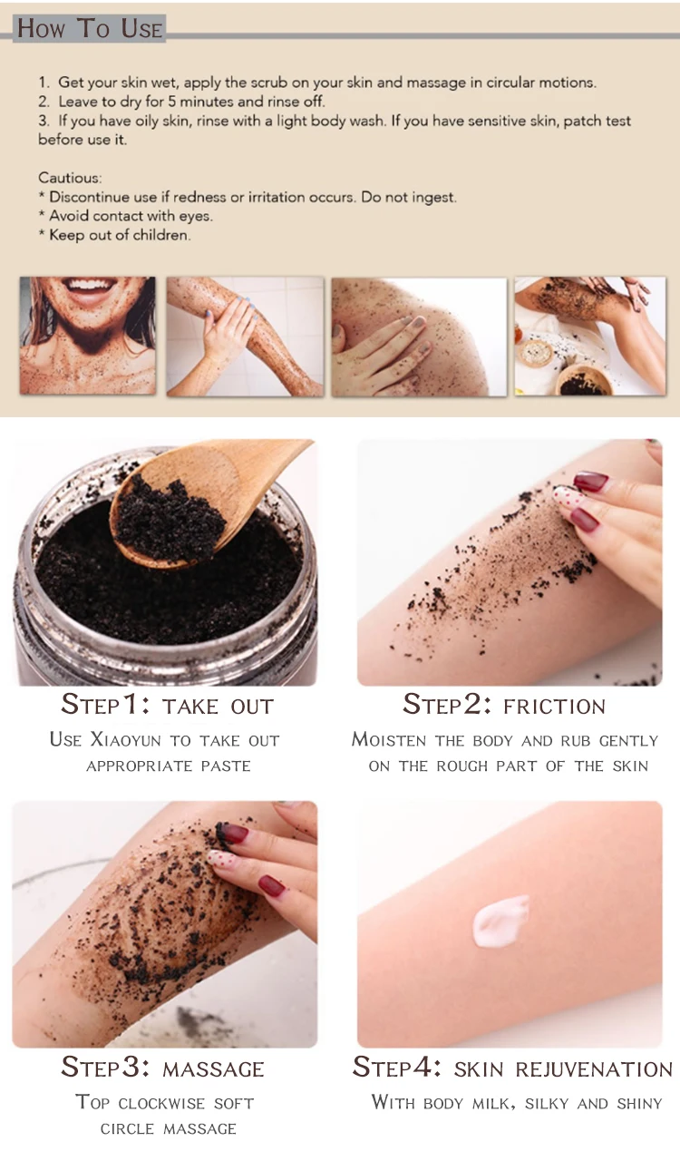 Особенности: 1. Содержит кофеин, который способствует разложению жира и сжигает жир. 2. Ускоряет кровообращение, массируя кожу. 3. Содержит антиоксиданты, замедляет старение кожи, уменьшает морщины, солнечные ожоги и т. д. 4. Используется вокруг глаз, он может разбавить темные круги и удалить отек глаз. 5. Натуральные частицы кофе механически отшелушиваются, заменяя химические вещества, безопасны и не раздражают. 6. Содержит кофеин для предотвращения варикозного расширения вен, уменьшения рубцов и затягивания кожи. 7. Для акне, целлюлита и растяжек имеют хороший эффект.