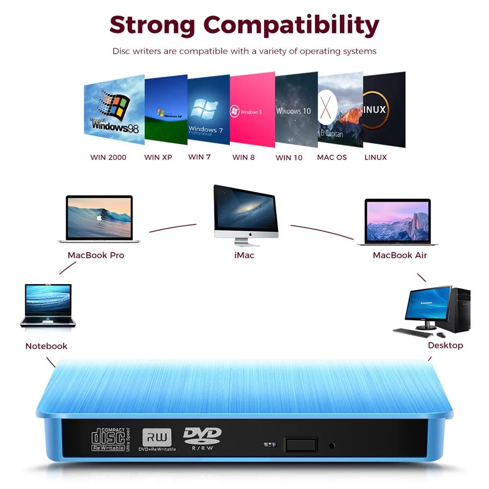Поддержка Операционная система: Window9/ME/2000/XP/VISTA/WIN7/WIN8/WIN10/MAC OS читать диск pa Оперативная память eters: CD-ROM: 24X, DVD-ROM: 8X DVD-ROM (DL): 6x Скорость записи: CD-R 24X CD-RW 4X DVD-R 8X DVD-RM 6X DVD-R DL 6X DVD/Оперативная память 5X DVD + R 8X DVD + RW 8X DVD + R DL 6X