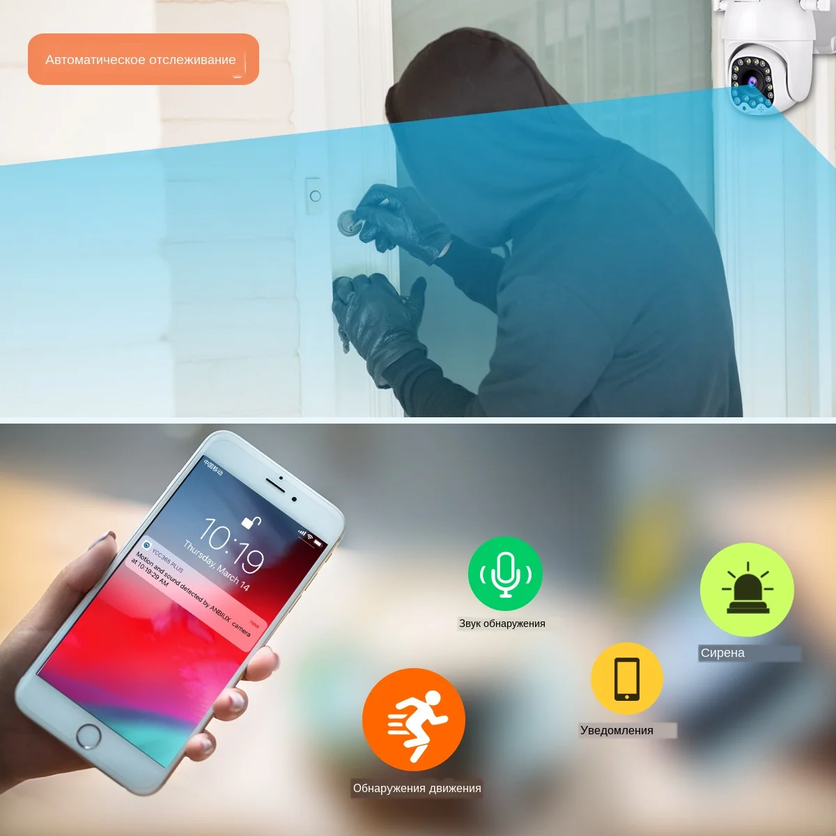 Когда кто-то ворвается в область съемки, обнаружение движения и отправка push-уведомления на вашем мобильный телефон.