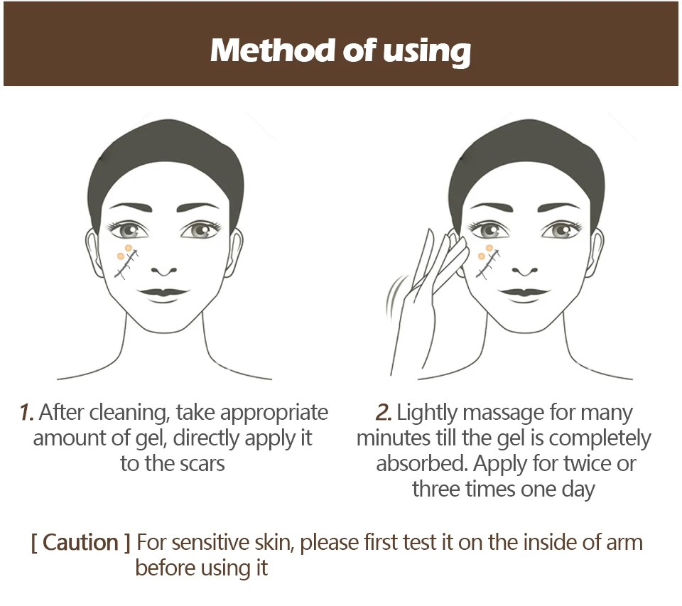 Способ использования 1. После очистки Возьмите необходимое количество геля, нанесите его непосредственно на шрамы 2. Слегка помассируйте в течение нескольких минут до полного впитывания геля. Примените дважды или три раза в день [внимание] для чувствительной кожи, пожалуйста, сначала проверьте его на внутренней стороне руки перед использованием