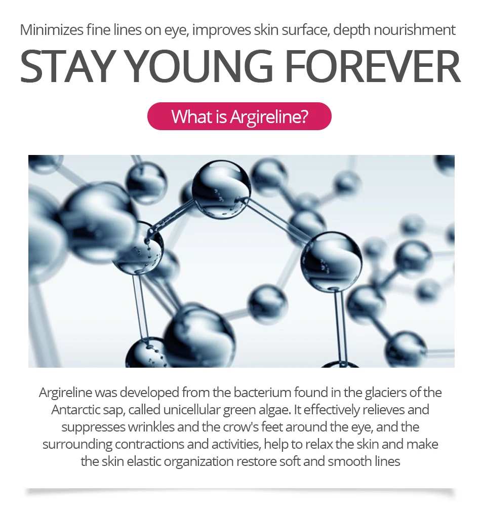 Минимизировать тонкие линии на лице, улучшает поверхность кожи, глубокое питание оставаться молодой навсегда что такое argireline? Argireline был разработан из бактерий, обнаруженных в ледниках Антарктического Сапа, называемых одноклетчатыми зелеными водорослями. Он эффективно избавляет и подавляет морщины и морщины вокруг глаз, а также окружающие сокращения и действия, помогают расслабить кожу и сделать кожу упругой организацией, восстанавливающей мягкие и гладкие линии