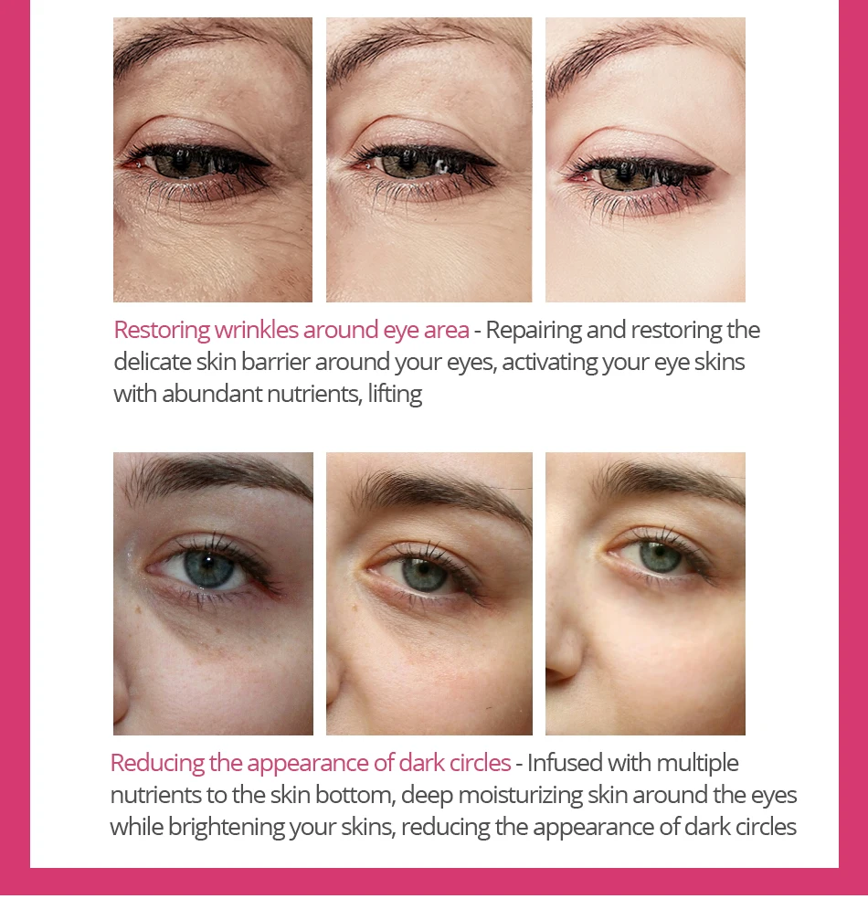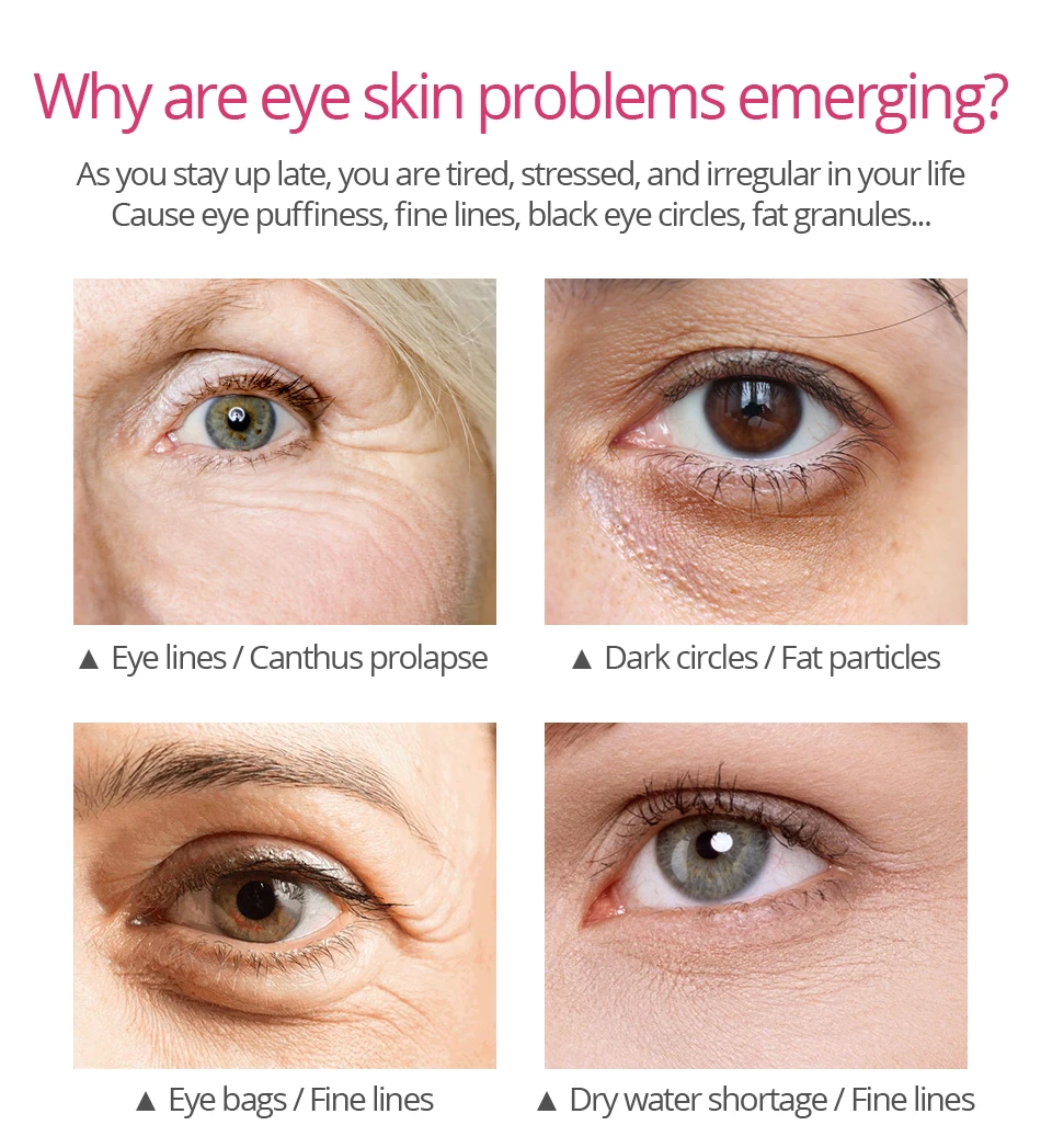 Почему возникают проблемы с кожей глаз? В последнее время вы устали, напряжены и нерегулярны в своей жизни, вызывают отечность глаз, тонкие линии, круги черных глаз, зернистые гранулы... Линии для глаз/canthus prolapse dack круги/мешки для глаз с жировыми частицами/тонкие линии для сухой воды/тонкие линии