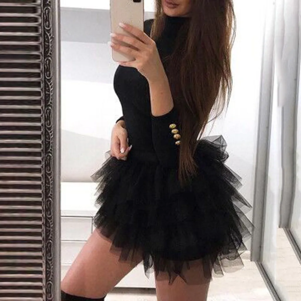Женское однотонное черное Сетчатое мини-платье со вставками, на пуговицах, с длинным рукавом, Сексуальные вечерние платья для клуба