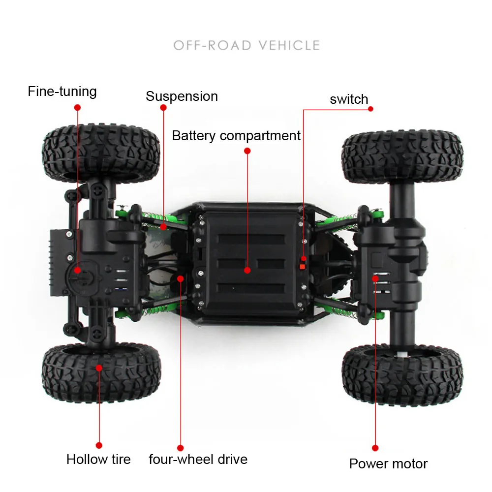 Высокая прочность Ударов. Для подъемов в гору Емкость и долговечная мощность. Крупногабаритные шины пусть Вы бесконечное Наслаждайтесь сумасшедшим бездорожьем. С высоким качеством сырья Материалы, более прочные и долговечные. Супер-сильным Конструкция для предотвращения столкновений-это конструкция, которая помогает защитить гусеница. 4 колеса и Мощные двигатели позволяют ему делать Потрясающие трюки, дают вам реальный опыт. Потрясающий внедорожный Транспортное средство для внутреннего и наружного использования, например, в песке, небольших скалах и других Прочная земли. Отлично подходит для восхождения Над предметами внутри/снаружи, бегать на гладкой, неровной или пересеченной местности, как Земля, трава, песок и камни. Противоударный-негабаритных Резиновые колеса и стабильные амортизаторы. Батарея работает (Перезаряжаемый), полная функция Pro рулевого управления (вперед и назад, поворот Левое и правое), регулируемое выравнивание переднего колеса, 4 привод, способный С легкостью борется с различными ландшафтами и препятствиями! 2,4 ГГц радио Управление Система для бесперебойного вождения без помех, Гонки нескольких автомобилей на В одно и то же времяТехнические характеристики:
