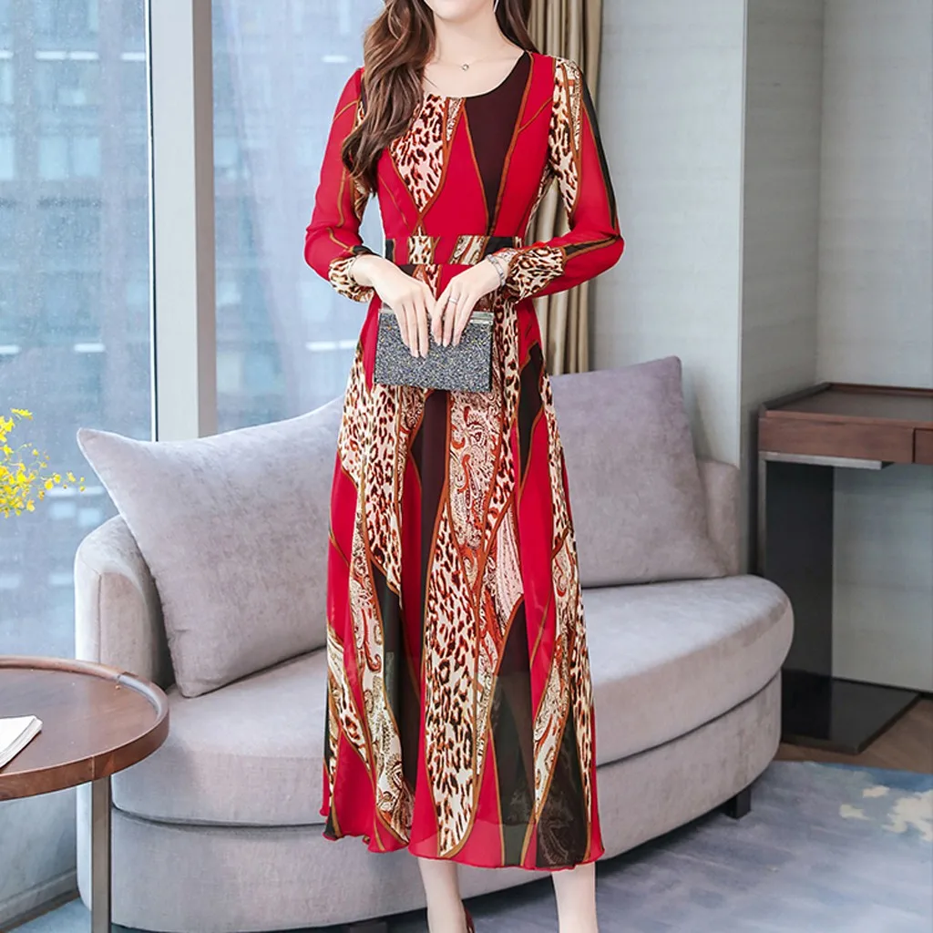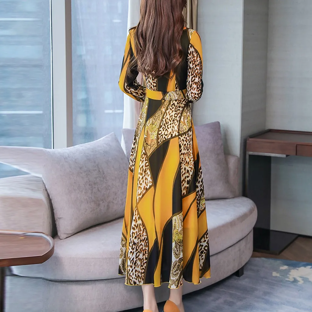 Женщины моды осень Lady O-образным вырезом до колен с длинным рукавом леопардовый платье