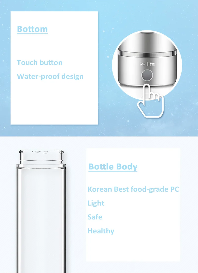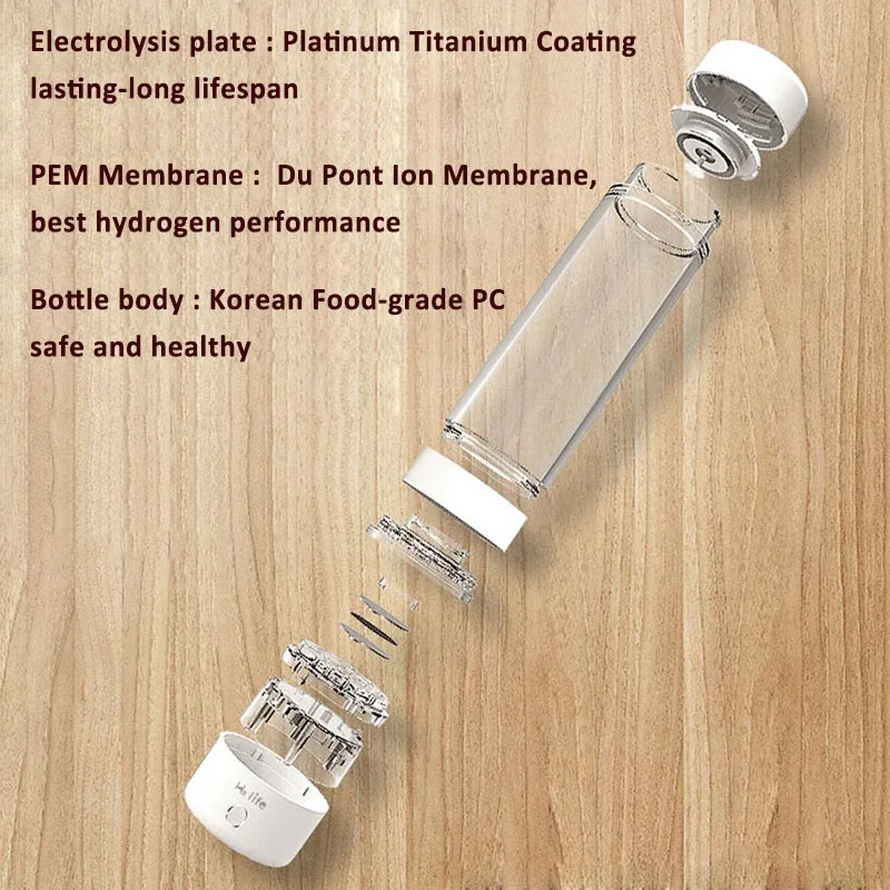С передовой технологией PEM и высококачественной мембраной водород и кислород могут быть на 100% разделены без озона, кислорода и других ионов смешаны в питьевой воде. Пластина электрода покрыта 7 слоями платины, которая прочна и хороша для здоровья. (Платина является одним из самых стабильных и дорогих металлов в природе. Он также широко используется в хирургии в обход сердца.) Высококачественный пищевой Поликарбонат, импортированный из Кореи. Это абсолютно безопасно. Все материалы, используемые для продукта, безвредны для людей. Некоторые из них даже полезны. Уникальная полуавтоматическая сенсорная кнопка, разработанная для этой бутылки, является водонепроницаемой, долговечной и не влияет на непреднамеренное прикосновение. Мы разработали выхлопывающие порты клапана вокруг нижней части бутылки, поэтому все примеси будут удалены как газ, не нужно сбрасывать.