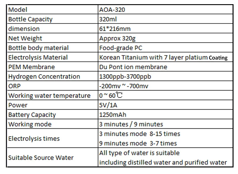 С передовой технологией и точной структурой, водородная концентрация, произведенная нашей бутылкой, может достигать 1900ppb за 3 минуты, максимум 3700ppb за 9 минут, в то время как средний уровень концентрации водорода в промышленности составляет около 1200ppb. Свободные радикалы вызывают множество здоровых проблем: В организме свободные радикалы вызывают аналогичное ухудшение, так как они разрушают клеточные мембраны и делают клетки уязвимыми для распада и патогенов. Эти свободные радикалы повреждают DNA и митохондрии, Основные строительные блоки всех тканей и оставляют на своем пути множество проблем со здоровьем. Водород удаляет свободные радикалы: Растворенные молекулы водорода ищут самые вредные свободные радикалы в наших телах и нейтрализует их, прежде чем они могут сделать больше повреждений наших клеток. H2 дарит электрон и связи со свободным радикалом для создания молекулы, в которой наши тела нуждаются в H20 или воде. AOA-320 имеет следующие особенности продукта: 1: эстетический дизайн, красивый 2. Du Pont PEM ионная мембрана 3. Импортируется из Титан с 7-слойная платиновым покрытием. 4. Корпус бутылки импортирован из пищевого ПК, здоровый 5. Два режима работы, 3 минуты и 9 минут 6. Удаление озона, хлора, кислорода и перекиси водорода 7. Водород макс. до 3700ppb за 9 минут и ORP-200мВ ~-700мв 8. Используйте эксклюзивную технологию растворения водорода, удерживайте высокий водород в воде более 2 часов после производства водорода. 9. Нет предела источника воды, даже дистиллированная вода и очищенная вода могут быть использованы. 10. Совместимость с пластиковыми бутылками с узким местом диаметром 26 мм 11. Яркие огни, выглядит красиво. 12. Сертификация WEEE, безопасность и гарантия продукта