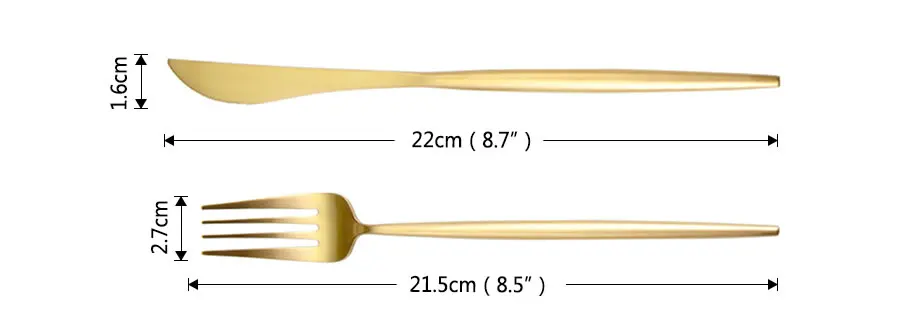 Knife:22*1.6cm , Fork:21.5*2.7cm , Meal spoon:21.2*4.9cm , Teaspoon:12.6*2.9cm