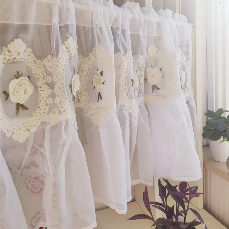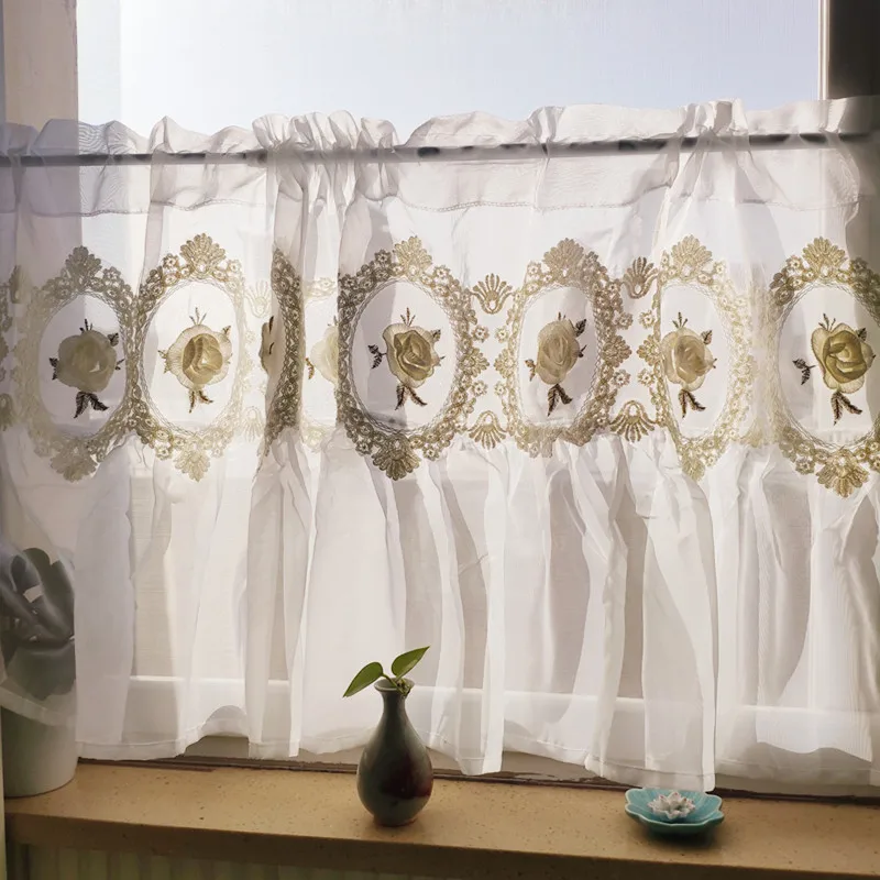 Описание продукта: Название: вышитая кофейная занавеска. Короткие шторы Материал: полиэфирная пряжа Размеры: 60 см, 90 см (высота), 150 см в ширину 2 цвета вышивка крестом картины. Кофейные и бежевые. Очень красивые маленькие шторы. Мягкий белый тюль. Светильник кофейного цвета с кружевной вышивкой и узором венка. Посередине-это трехмерный цветок розы. Элегантный и красивый. Очень элегантный и женственный. Очень хороший декоративный эффект. Диапазон использования: дверная рама. Шкафы, окна, перегородки для интерьера и т. Д.