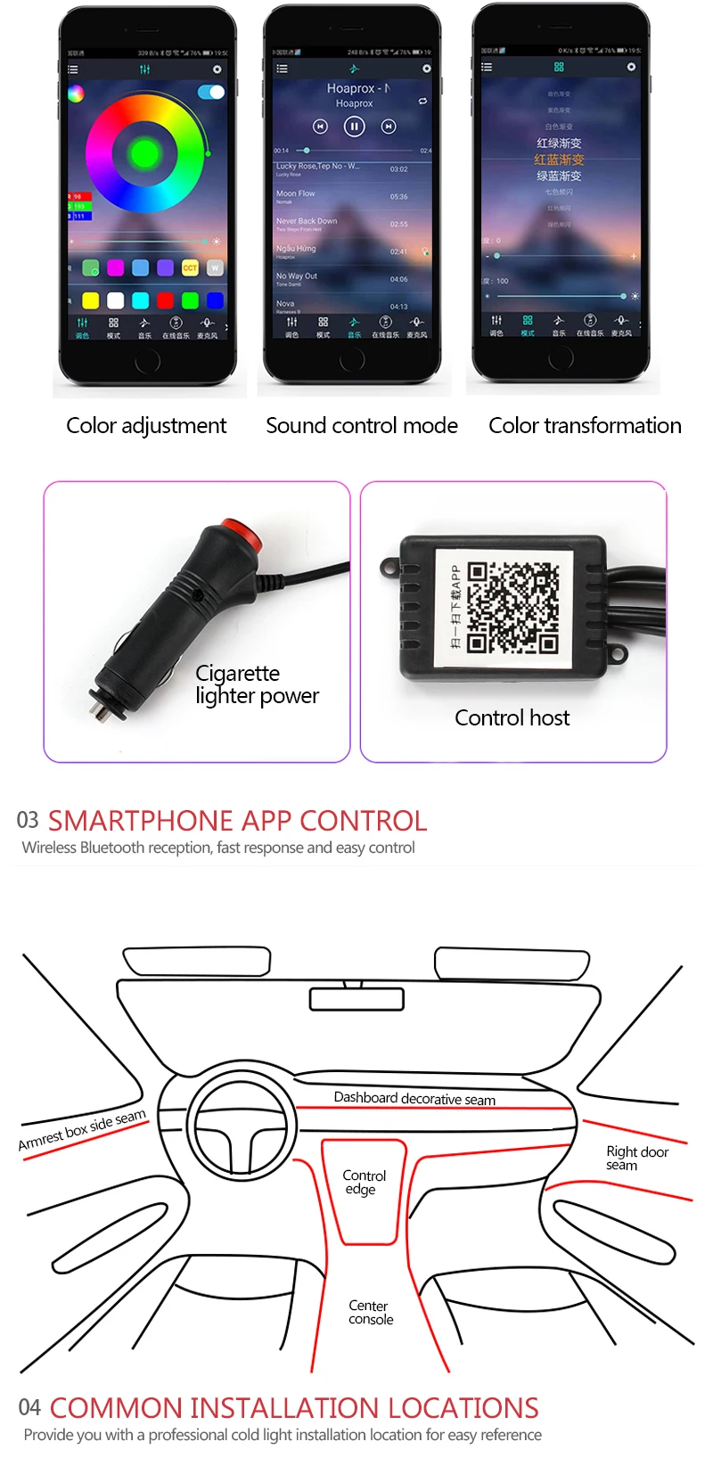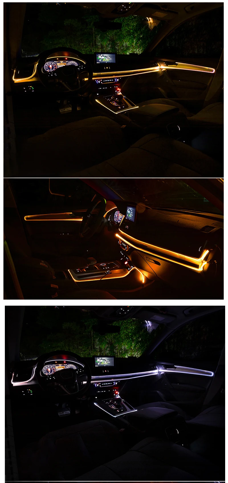 1. Режим RGB, большинство цветов в наличии, красочные светосветильник полосы для салона автомобиля, наслаждайтесь досугом и расслабьтесь за рулем.