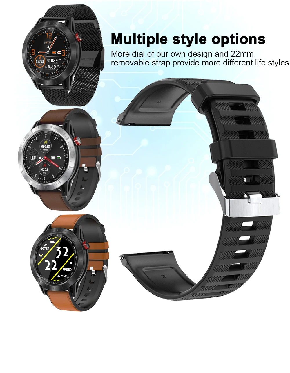 Более широкий циферблат нашего собственного дизайна и 22 мм съемный ремешок обеспечивают больше различных стилей жизни