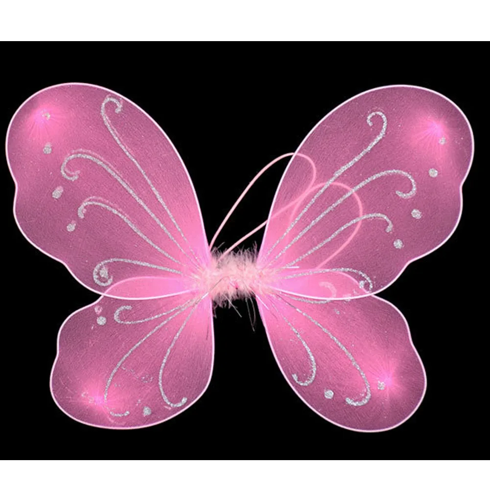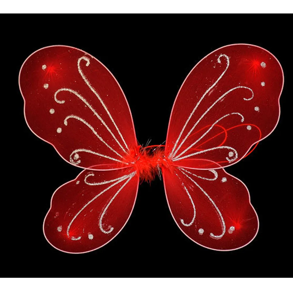Он изготовлен из мягкой нейлоновой ткани над проволочным крылом, что позволяет согнуть крыло под желаемым углом, включая стразы, блестящий дизайн и перья посередине.