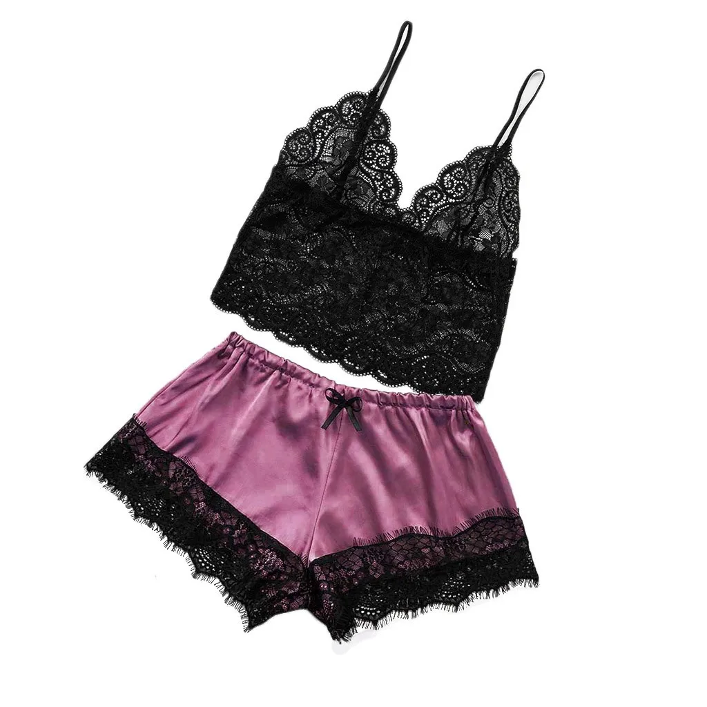 Женский атласный кружевной топ с v-образным вырезом, шорты с бантиком, комплект одежды для сна, пижамы, нижнее белье