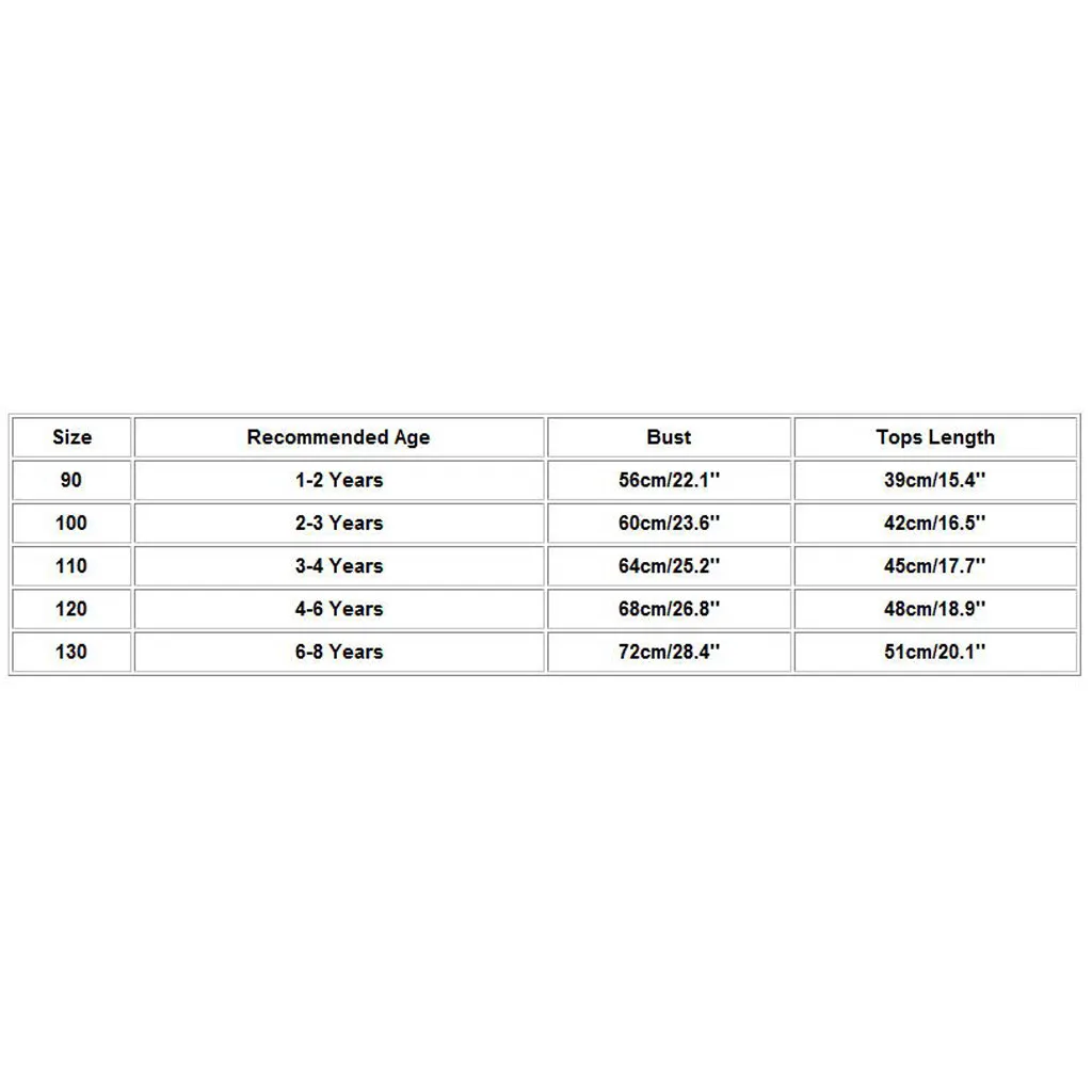 Размер Рекомендуемый возраст Бюст Длина топа 90 1-2 года 56 см/22,1'' 39 см/15,4'' 100 От 2 до 3 лет 60 см/23,6'' 42 см/16,5'' 110 От 3 до 4 лет 64 см/25,2'' 45 см/17,7'' 120 От 4 до 6 лет 68 см/26,8'' 48 см/18,9'' 130 От 6 до 8 лет 72 см/28,4'' 51 см/20,1''