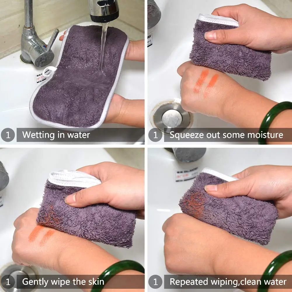Только с помощью воды, наша ткань для снятия макияжа из микрофибры может удалять косметику, тени для век, тональный крем, помаду, солнцезащитный крем, в том числе водостойкую косметику. Если вы хотите использовать Средство для снятия макияжа, это будет лучше.