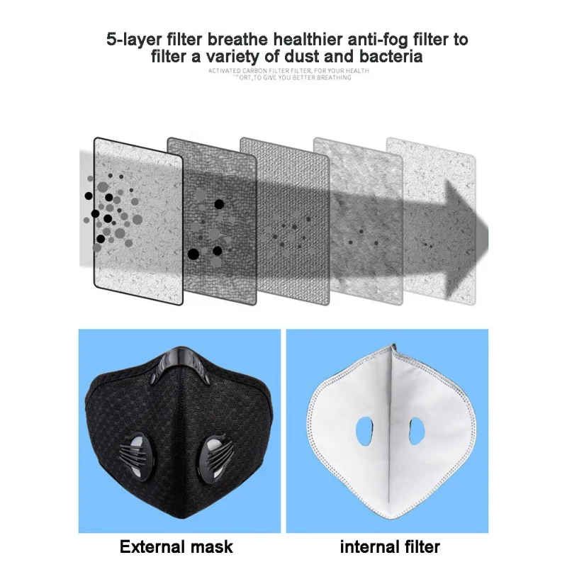 -Сетчатая Пылезащитная маска хорошо изготовлена из высококачественного полиэстера, обеспечивая отличную проницаемость. Более толстый и полный фильтр из углеродного волокна делает фильтрующий слой более чистым и гигиеничным.