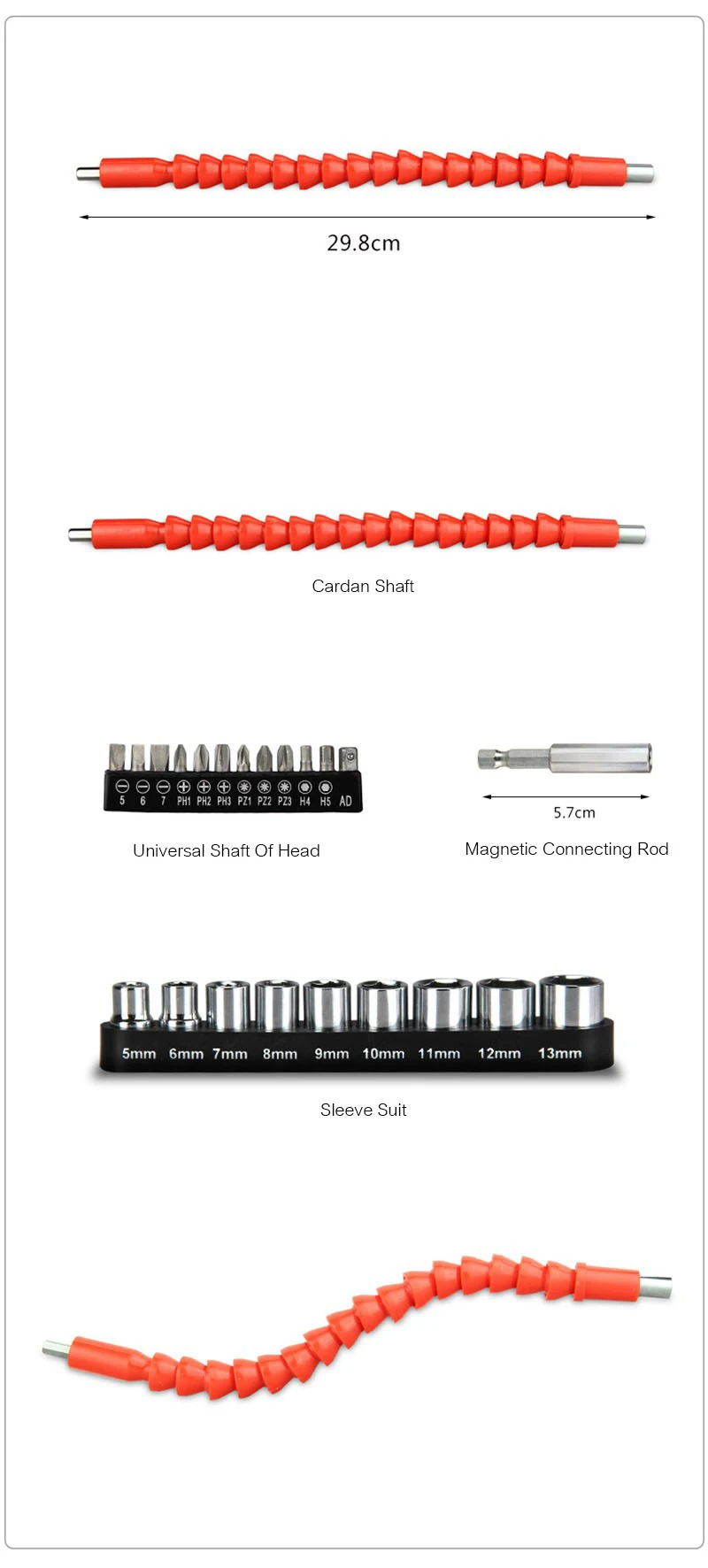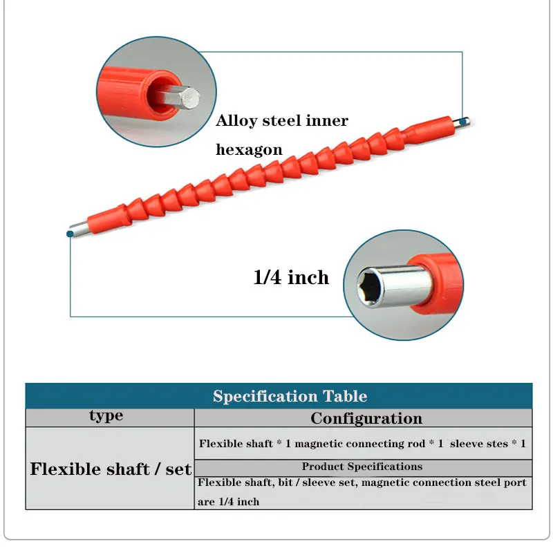 Особенности: С мягким пластиком в качестве основного материала, он может работать в 360 градусов без мертвых углов в различных узких и суровых условиях. Он подходит для небольших гаечных ключей, ручных сверл и небольших воздушных партий с крутящим моментом. Степень изгиба может быть относительно большой, а также может использоваться нормально. Он не должен использоваться нормально после сгибания, что является недостатком металлических валов. Спецификация: Длина: 298 мм Размер сверла с шестигранным хвостовиком 6,35 мм (1/4 ") Размер соединительной гайки 6,35 мм (1/4 ")