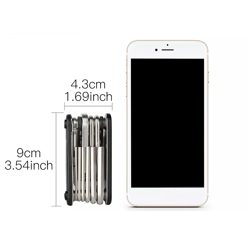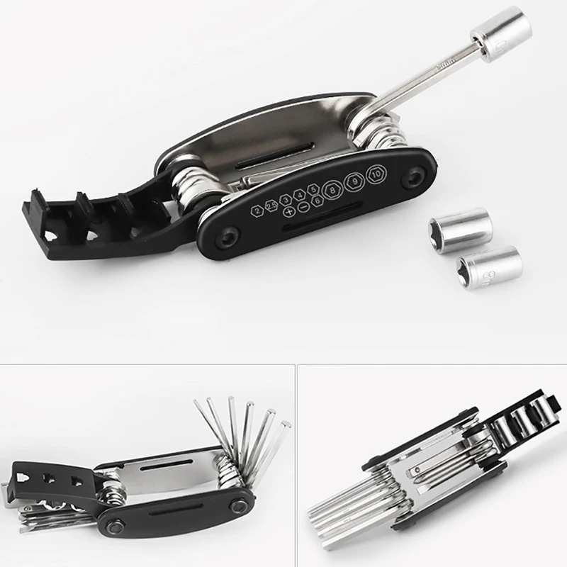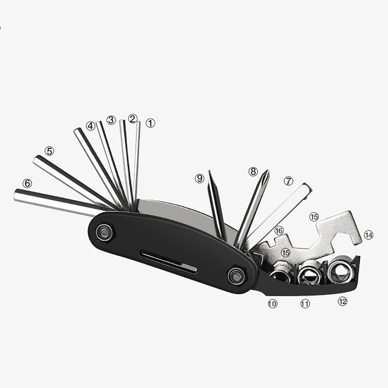 16-в-1 складной ремонтный инструмент, шестигранный ключ 2/2.5/3/4/5/6 мм, шлицевая отвертка, отвертка Phillips, удлинитель рукава, спицы, ручной ключ, 10/10/15 мм
