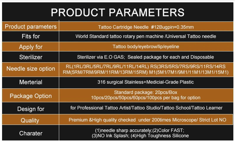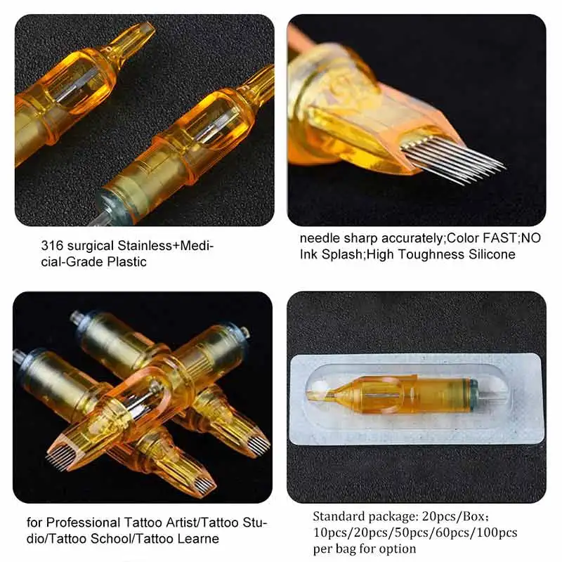 1. Иглы для татуировок изготовлены из точной формы, с низким уровнем шума, это поможет профессиональному татуировщику. 2. RL/RM/M1/RS четыре дополнительных типа с несколькими размерами будут соответствовать различным иглы татуировки. 3. Более того, одноразовый материал быстро изменяется и обеспечивает идеальную, несложную и гигиеническую работу.