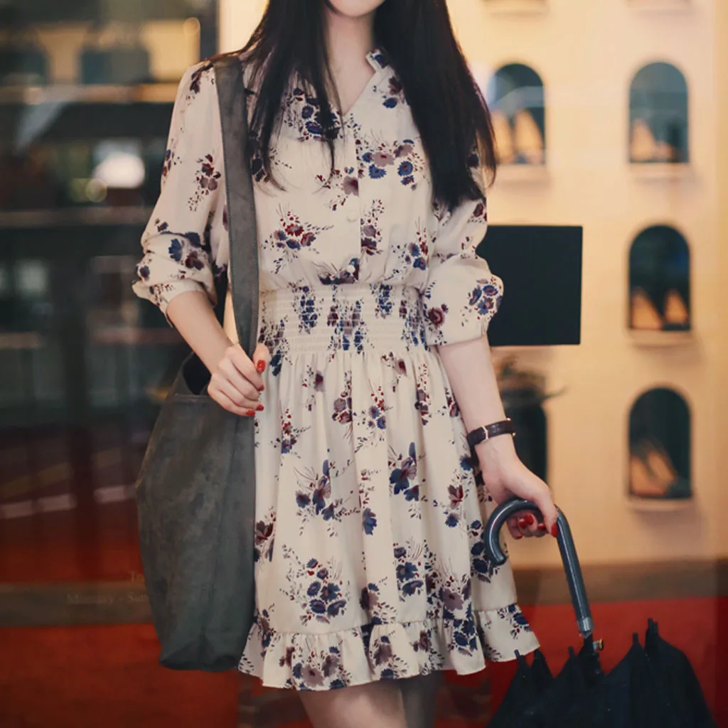 Модное женское свободное платье с длинным рукавом и поясом, маленькое Цветочное платье