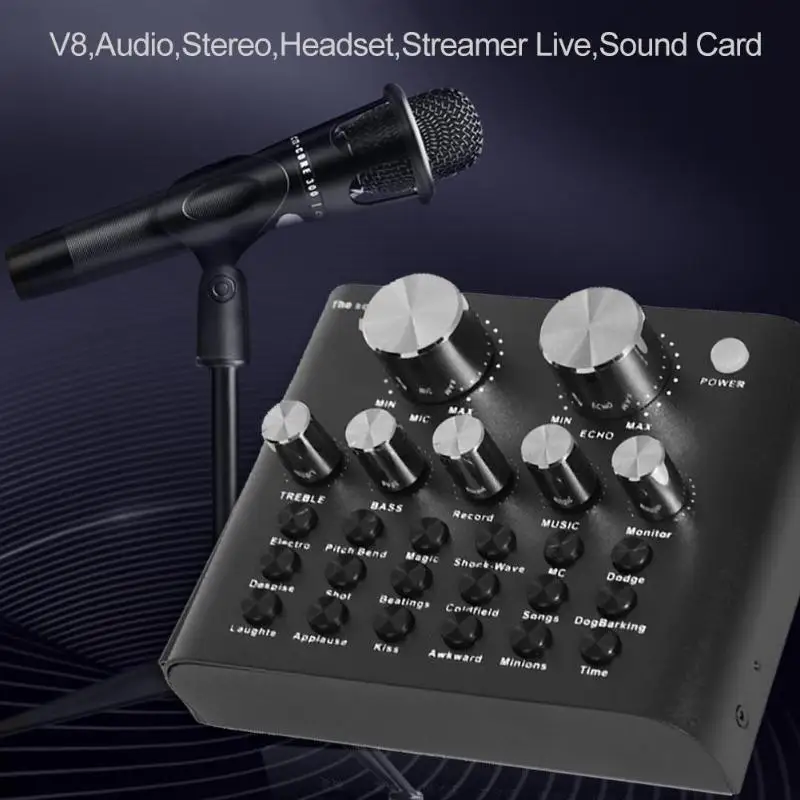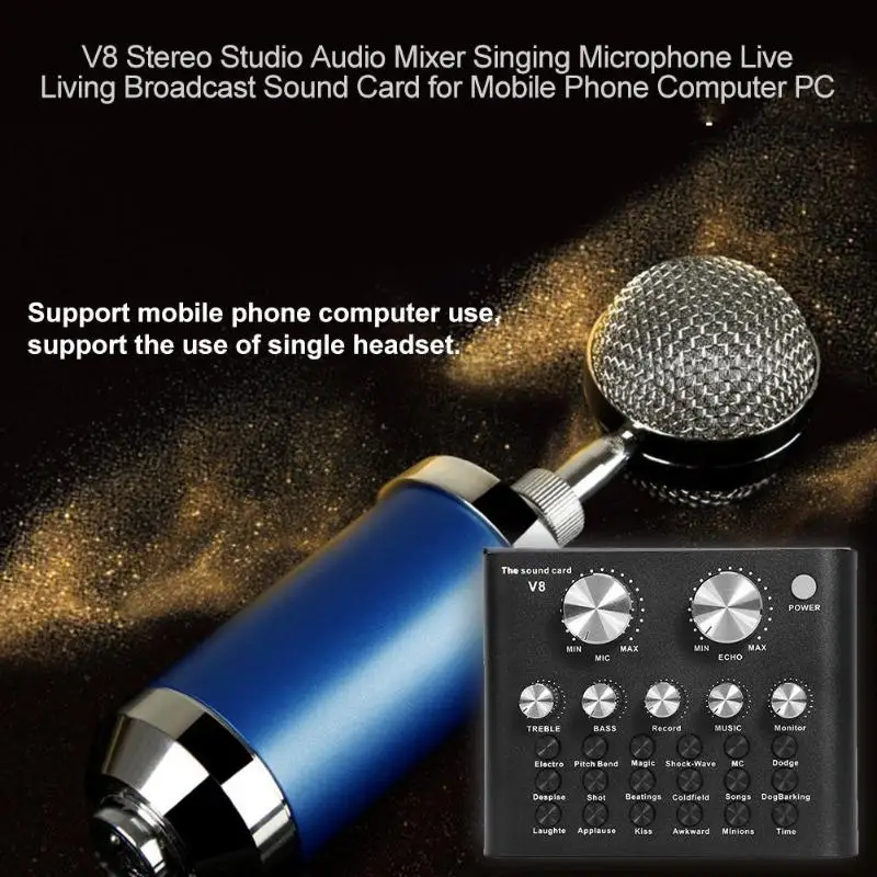 V8 Стиль BБез Bluetooth Характеристика: 1. Чип звукового эффекта DSP, ручка настройки, 12 видов звуковых эффектов, устранение оригинального звука, пение в режиме реального времени, избегание одной кнопки, мониторинг в реальном времени, аккумулятор большой емкости. 2. Мощный DSP аудио двойной чип, лучшая стабильность, лучший сигнал, четкое качество звука без задержки, новое обновление. 3. Поверхность корпуса пескоструйная с металлической краской. Он имеет ощущение шлифования, устойчивость к царапинам, удобный и деликатный на ощупь. 4. Дизайн поверхности капель, гальванические ключи, гальванические ручки, металлическая краска для распыления. 5. процесс реверберации/преобразователя/электроакустического перекрытия не заглушен, основная частота увеличивается с 80 МГц до 320 МГц, что в четыре раза превышает скорость обработки общей звуковой карты на рынке, а эффект прямой трансляции более реалистичный. 6. Дизайн ручки настройки. 7. С 12 тонами, профессиональная Регулировка тона. 8. Волшебное изменение, изменение голоса богини/дяди/детей. 9. Поддержка использования только мобильных компьютеров и наушников. 10. Мониторинг возврата уха в режиме реального времени, прямое вещание голоса пения, прослушивание наушников обратно к ушам, вы можете своевременно настроить дыхание и ритм, чтобы избежать выгула. 11,7 виды способов подключения: одно мобильное K song живое вещание, два мобильных прямого вещания, три мобильных телефона живое вещание, мобильный телефон компьютер синхронное прямое вещание, один компьютер живое вещание, компьютерное сопровождение мобильного телефона прямого вещания, музыкальный инструмент ввода мобильного телефона прямого вещания. 12. Высокопроизводительный полимерный литиевый аккумулятор емкостью 1200 мА · ч, подключаемый к прямой трансляции.
