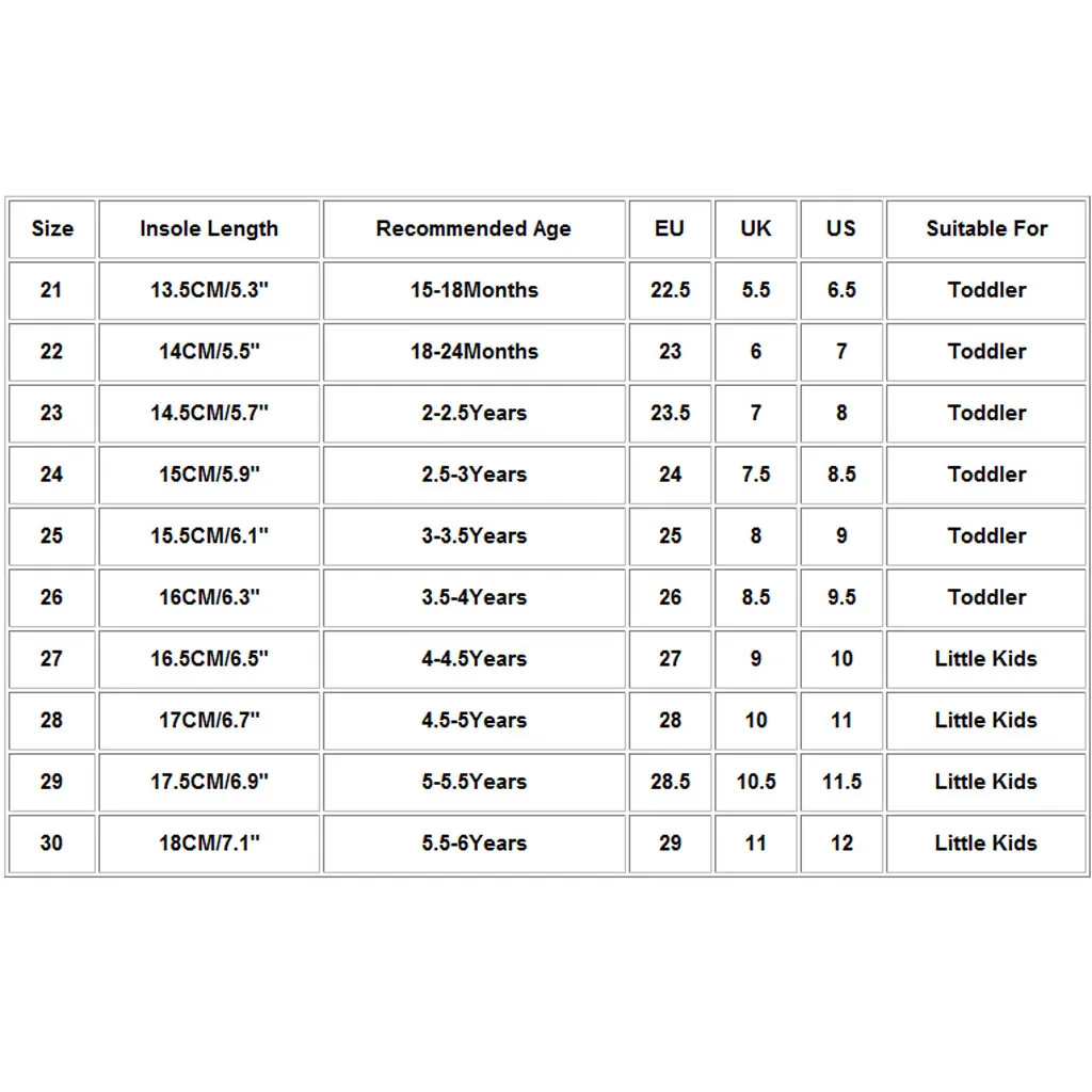 Размер Длина стельки Рекомендуемый возраст ЕС Великобритания США Подходит для 21 13,5 см/5,3 дюйма 15-18 месяцев 22,5 5,5 6,5 Для малышей 22 14 см/5,5 дюйма 18-24 месяцев 23 6 7 Для малышей 23 14,5 см/5,7 дюйма 2-2-5 лет 23,5 7 8 Для малышей 24 15 см/5,9 дюйма 2,5-3 года 24 7,5 8,5 Для малышей 25 15,5 см/6,1 дюйма 3-3,5 года 25 8 9 Для малышей 26 16 см/6,3 дюйма 3,5-4 года 26 8,5 9,5 Для малышей 27 16,5 см/6,5 дюйма 4-4,5 года 27 9 10 Маленькие дети 28 17 см/6,7" 4,5-5 лет 28 10 11 Маленькие дети 29 17,5 см/6,9 дюйма 5-5 лет 28,5 10,5 11,5 Маленькие дети 30 18 см/7,1" 5,5-6 лет 29 11 12 Маленькие дети