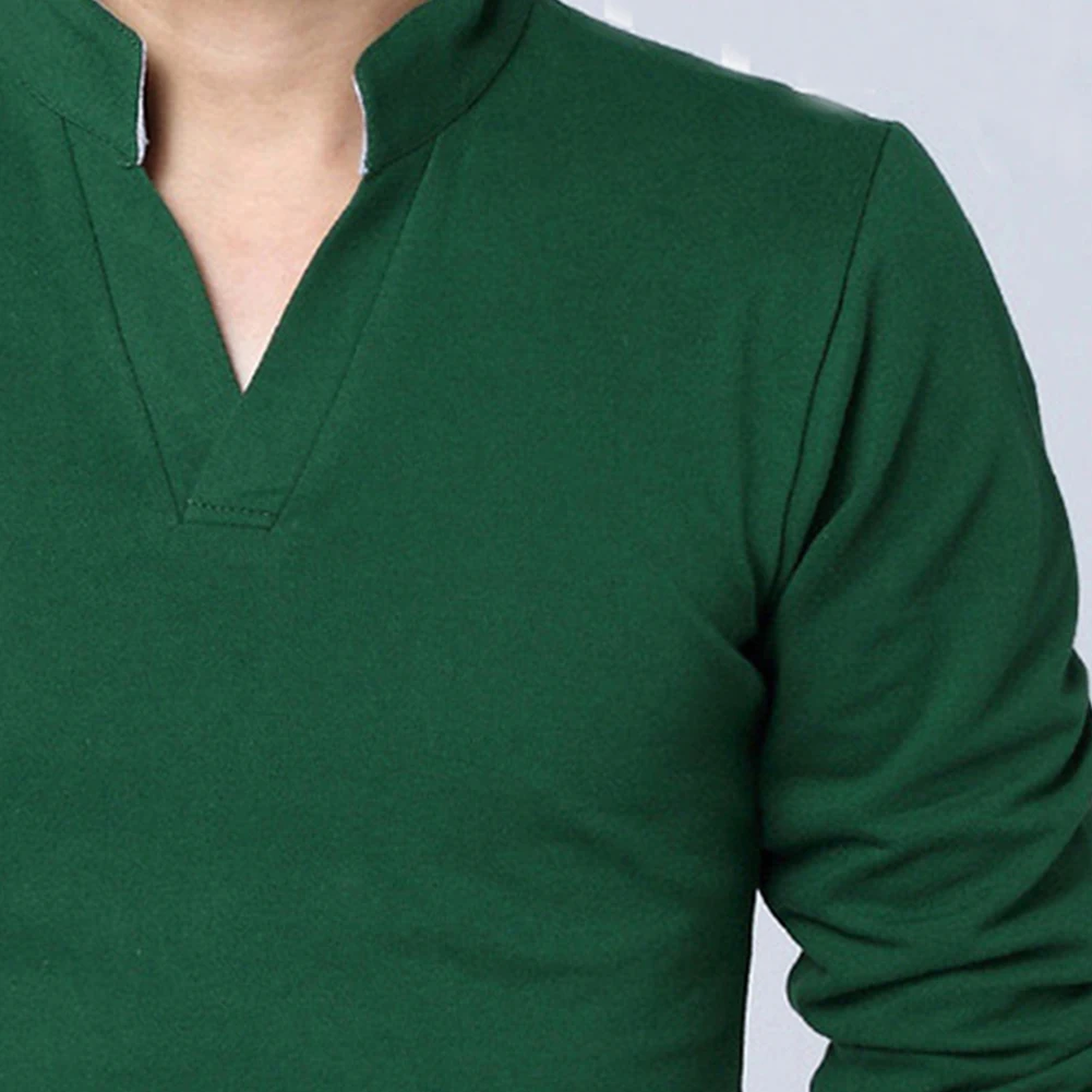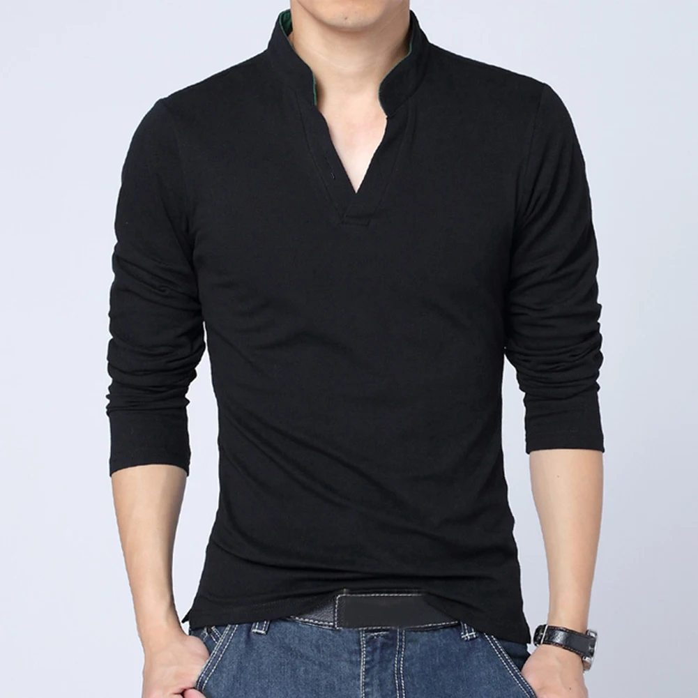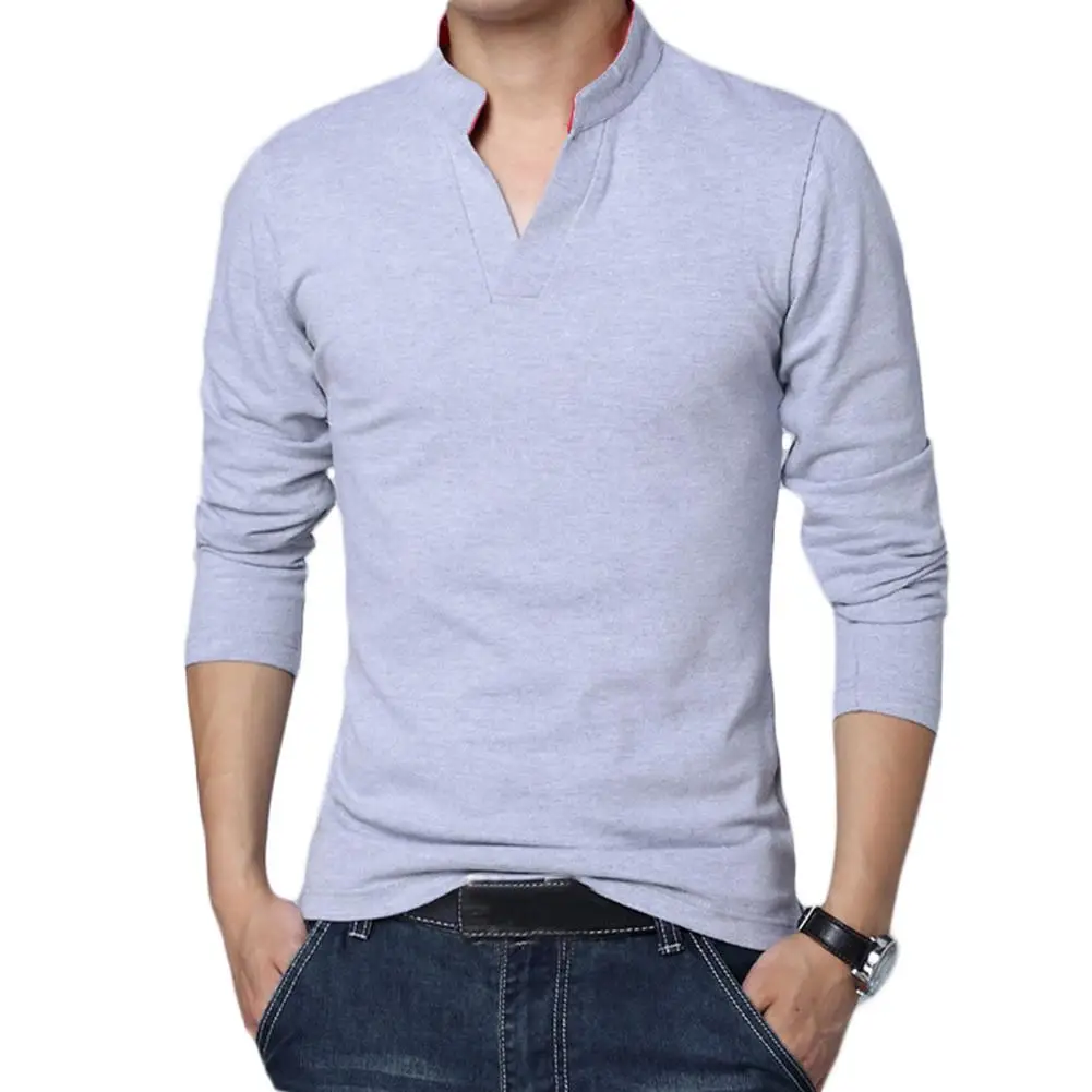 Однотонная мужская повседневная футболка с воротником-стойкой и v-образным вырезом с длинным рукавом