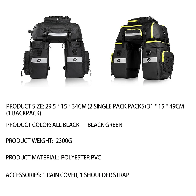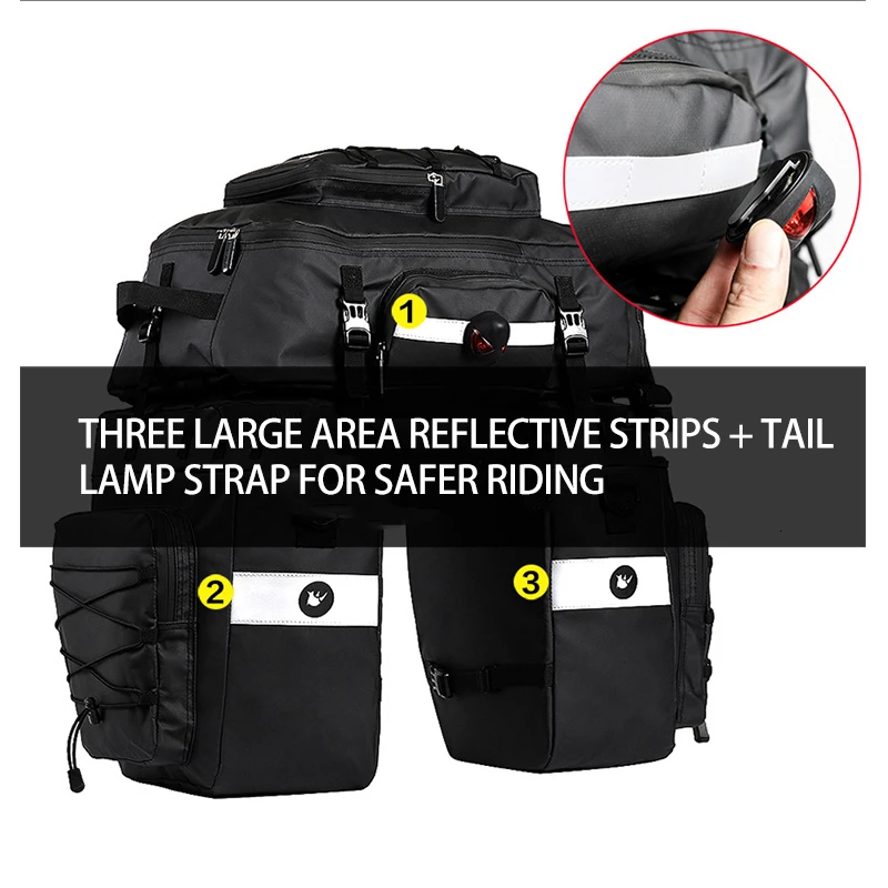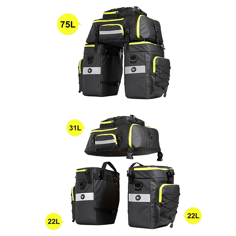 2. большая емкость: две боковые корзины 22 л/каждый, один рюкзак 31 л, которые совместимы со всеми предметами велосипедной необходимости, такими как тонкая одежда, обувь, косметичка, ноутбук, инструменты для ремонта велосипеда и т. Д.
