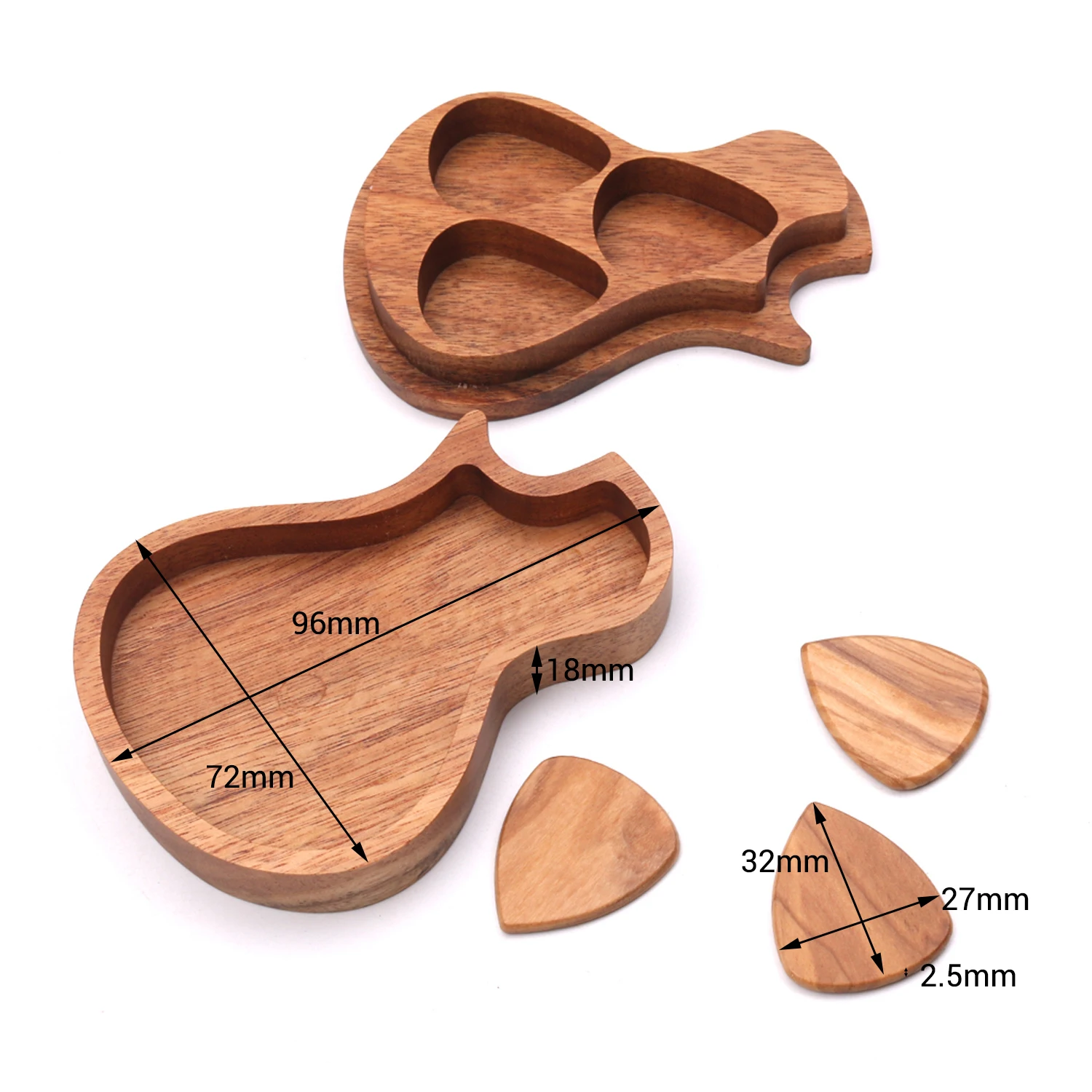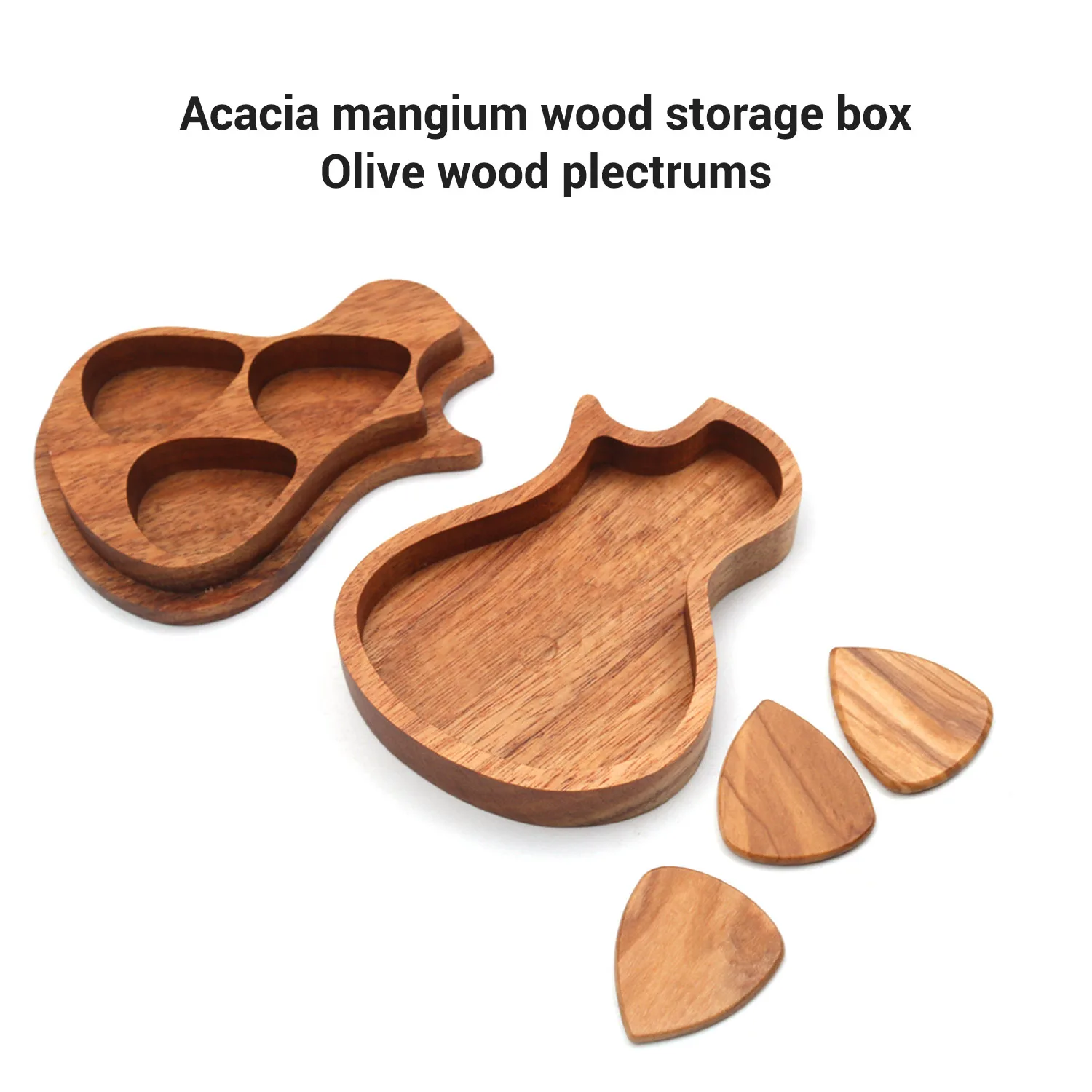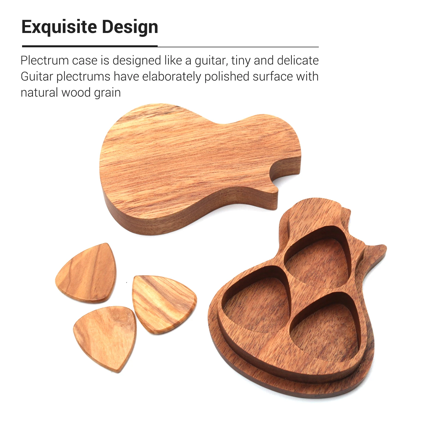 Ящик для хранения изготовлен из мангиевого дерева акации, а медиаторы для гитар изготовлены из оливкового дерева, отличающегося тонкой прочностью, долгим сроком службы.