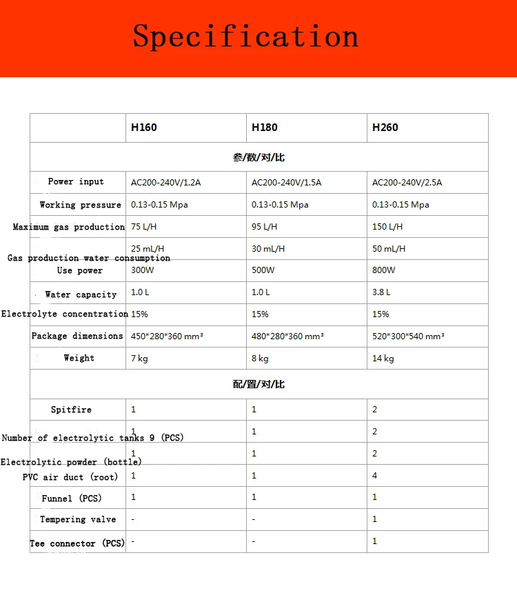 Параметры продукта Характеристики: H160 Параметры продукта H160 Потребляемая мощность: AC200-240V/1,2 A Рабочее давление: 0,13-0,15 МПа Максимальная продукция газа: 75л/ч Максимальное потребление воды в Газе: 25 мл/ч Потребляемая мощность: 300 Вт Емкость воды: 1.0л Содержание электролита: 15% Вес: 10 кг Характеристики: H180 Параметры продукта H160 Потребляемая мощность: AC200-240V/A Рабочее давление: 0,13-0,15 МПа Максимальная продукция газа: 95л/ч Максимальное потребление воды в Газе: 30 мл/ч Потребляемая мощность: 500 Вт Емкость воды: 1.0л Содержание электролита: 15% Вес: 10 кг