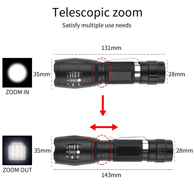 Светодиодный фонарик высокого качества: светодиодный фонарик изготовлен из высококачественного алюминиевого сплава, который устойчив к царапинам и не абразивен. Ручной фонарик не будет легко соскальзывать с руки из-за противоскользящей конструкции на поверхности.