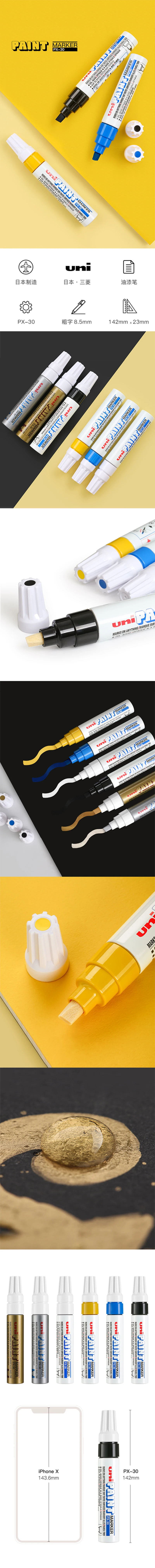 Uni PX-30, он может быть написан на различных поверхностях, с сильной способностью покрытия, водонепроницаемый, не легко выцветает и имеет широкий спектр применений. Эта ручка для рисования спроектирована с акриловыми квадратными головками и может быть написана на различных поверхностях, включая металлические поверхности, небольшие царапины на различных поверхностях, а также может использоваться в автомобильных касаниях ups. Износостойкий волоконный наконечник не легко деформируется, а письмо гладкое. При использовании в первый раз сменная ручка трясется назад и вперед на некоторое время, затем кончик ручки нажимается вниз, пока чернила не будут насыщены кончиком пера.
