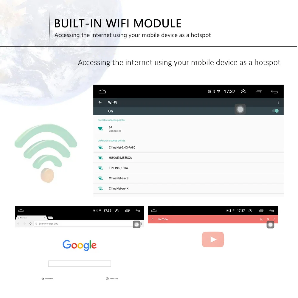 1. Радио (FM) 2. Чтение u-диска (аудио/видео/картинка) 3. Задняя AUX Функция 4. Функция Bluetooth 5. Аудиовыход RCA может быть подключен к сабвуферу 6. Функция заднего вида (опционально камера) 7. Видео вход 8. Оригинальная функция обучения рулевого колеса автомобиля 9. Можно установить Android recorder 10. WI-FI Интернет 11. GPS навигации 12. Мобильный Интернет (Android / Apple) 13. Можно установить приложение