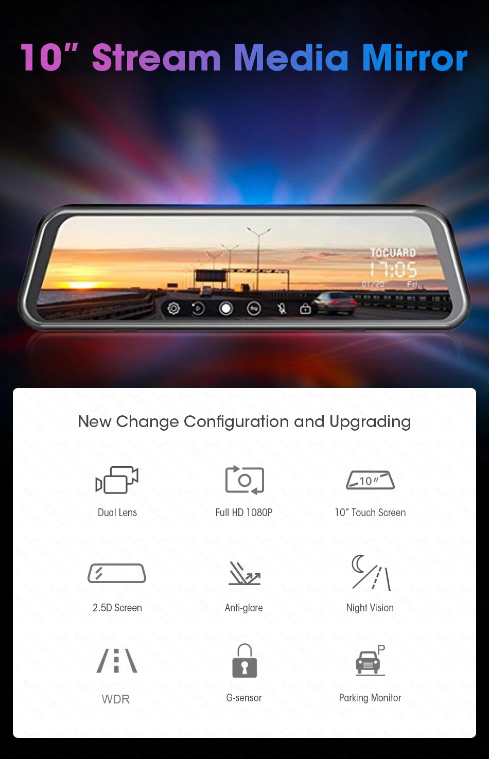 Особенности продукта: Двойной объектив, обнаружение движения, светодиодный дисплей, SD/MMC карта, циклическая запись, ночное видение, автоматический баланс белого, анти-туман, отображение времени и даты, циклическая запись, анти-вибрация, зеркало заднего вида, широкий динамический диапазон, микрофон, датчик g-sensorimaging, полноэкранный дисплей 9,66 дюйма