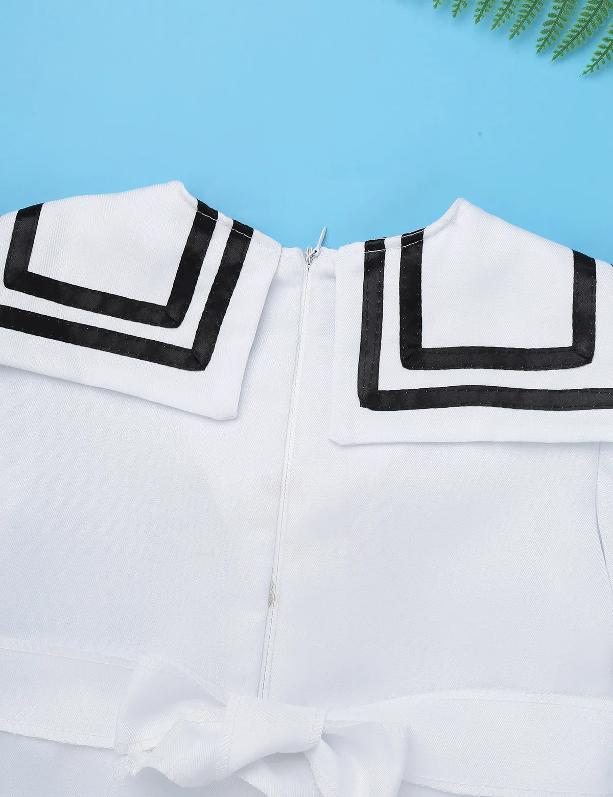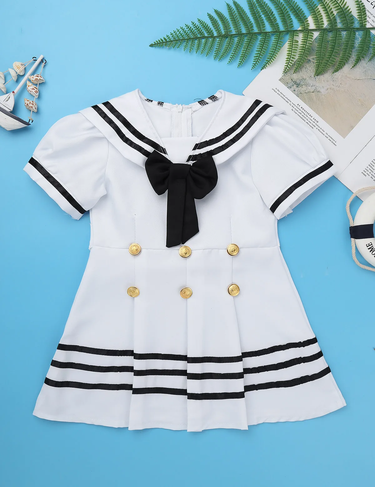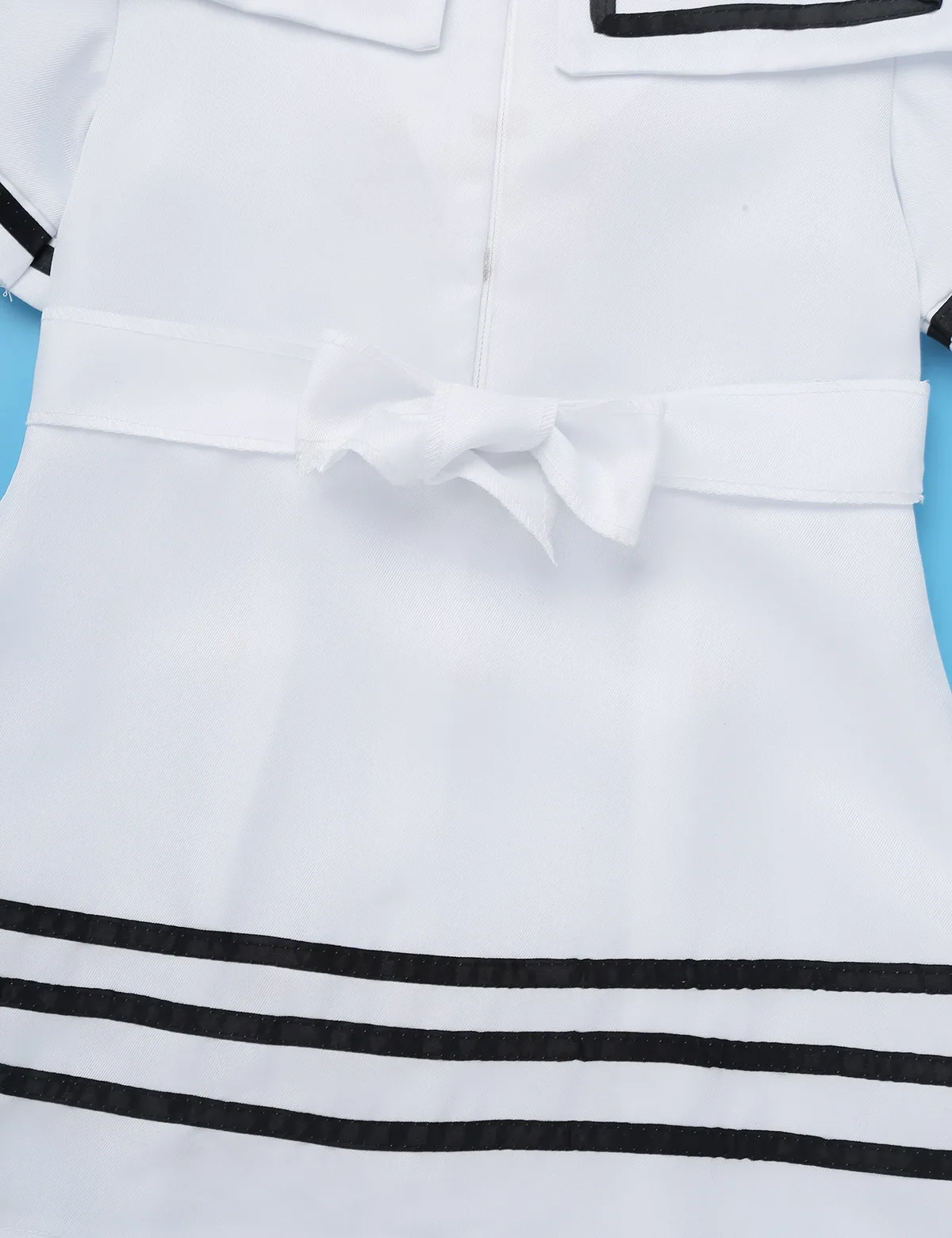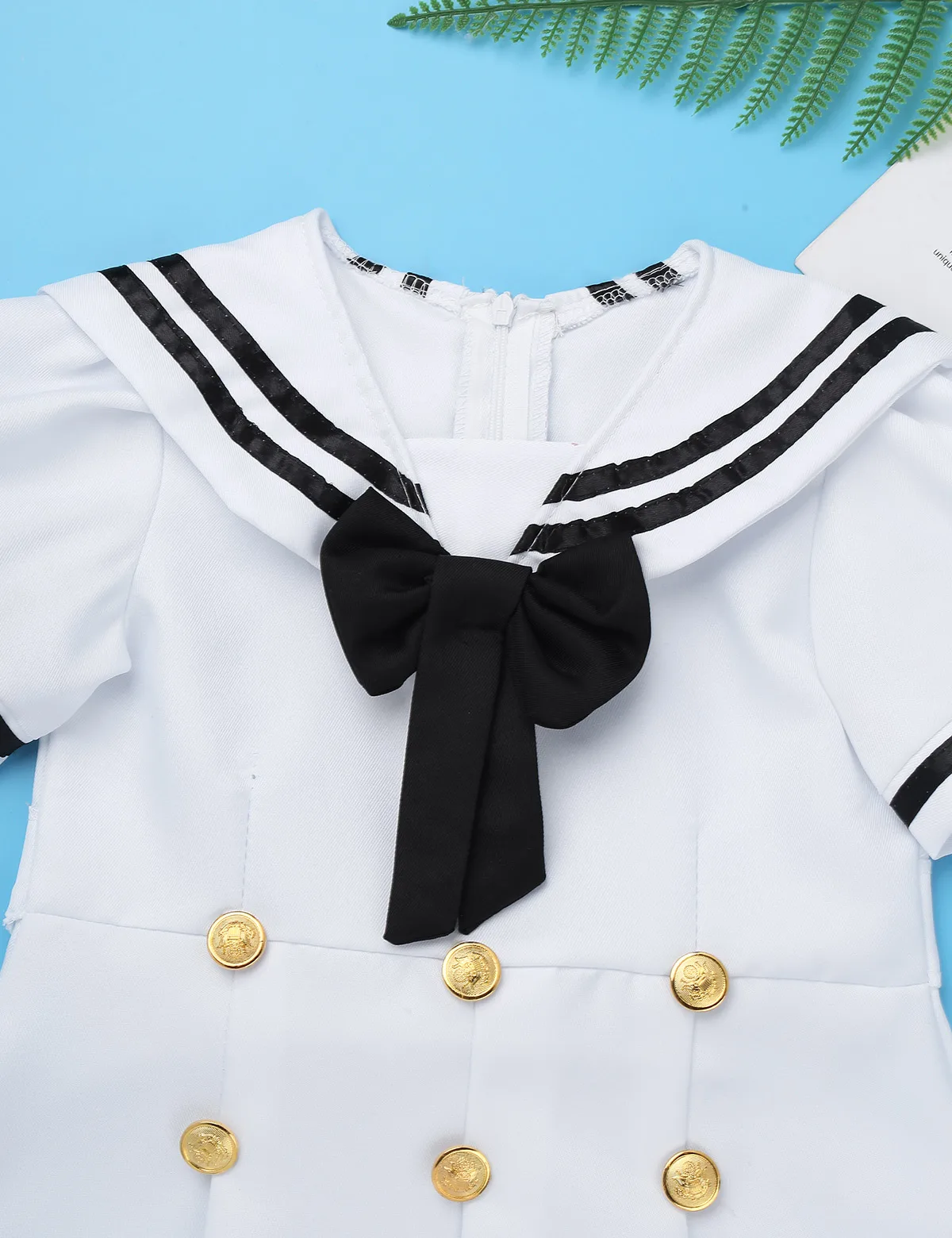 Short sleeves, sailor collar, six gold nautical buttons and an attached bow in front. Sash ties at back, back zipper closure.