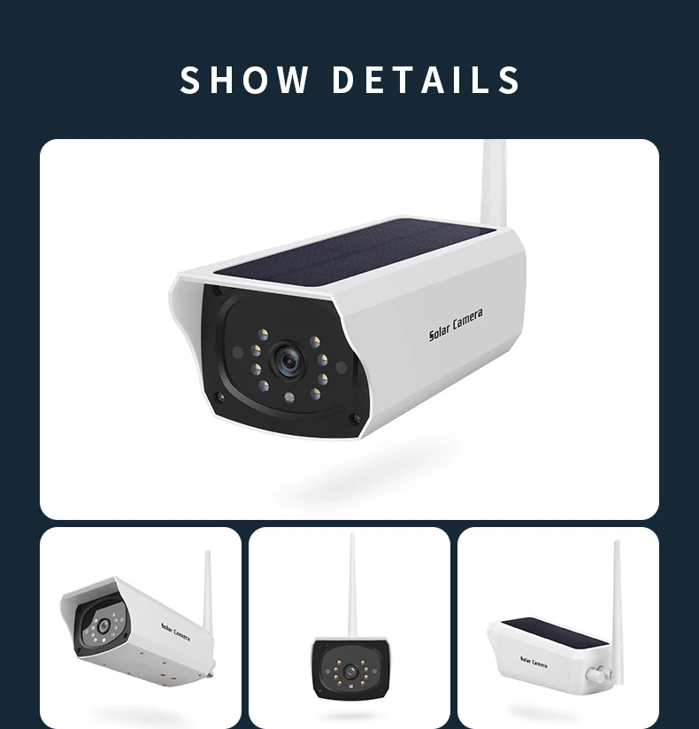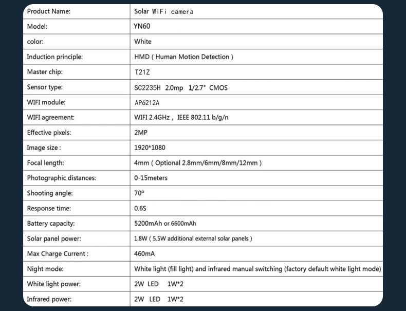 Спецификация: ● Название продукта: Солнечная WiFi камера ● Принцип индукции: HMD (обнаружение движения человека) ● WiFl соглашение: WFI2.4GHz. IEEE 802,11 b/g/n • Фокусное расстояние: 4 мм (опционально 2,8 мм/6 мм/8 мм/12 мм) ● Ночной режим: белый светильник (заполнение ligaht) и инфракрасный ручной переключатель (заводской по умолчанию белый светильник ● Белый светильник: 2 Вт светодиодный 1 Вт * 2 ● Инфракрасная мощность: 2 Вт светодиодный 1 Вт * 2