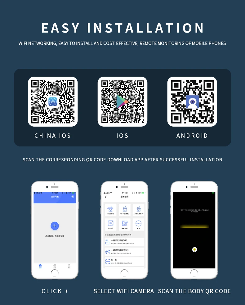 ● Сеть Wi-Fi, простота установки и экономичность, удаленный мониторинг мобильных телефонов ● Отсканируйте соответствующее приложение для загрузки qr-кода после успешной установки
