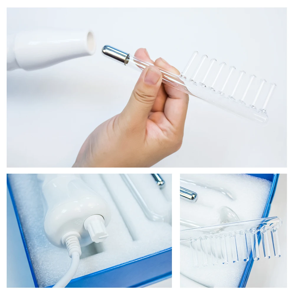Introduction: The high frequency electrotherapy is an important beauty instrument. It is through the glass electrode tube to produce high frequency current, and apply to the skin, thus achieves the treatment result. It helps to calm the nerve and has analgesia function. Has the function of anti-aging, anti-wrinkle and skin-tightened. Improve secretion, the PH value causes the skin lean to neutrality. Accelerate blood circulation and improve metabolism. It produces the ozone for sterilization, can help wound to heal and to restrain pores. Features: Remove spot Heal skin scars Enhance blood circulation Improve lymph activity Help skin nutrition Strengthen cell metabolism Improve secretion and PH value Diminish inflammation Sterilize bacteria Accelerate healing of wounds Reduce visible skin pores
