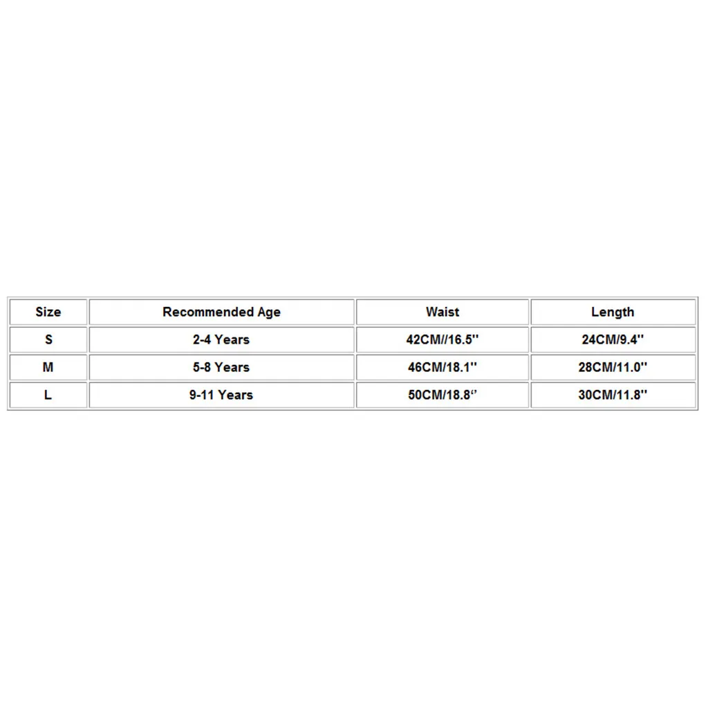 Размер Рекомендуемый возраст Талия Длина S 2-4 года 42 см/16,5'' 24 см/9,4'' М От 5 до 8 лет 46 см/18,1'' 28 см/11,0'' L От 9 до 11 лет 50 см/18,8'' 30 см/11,8''
