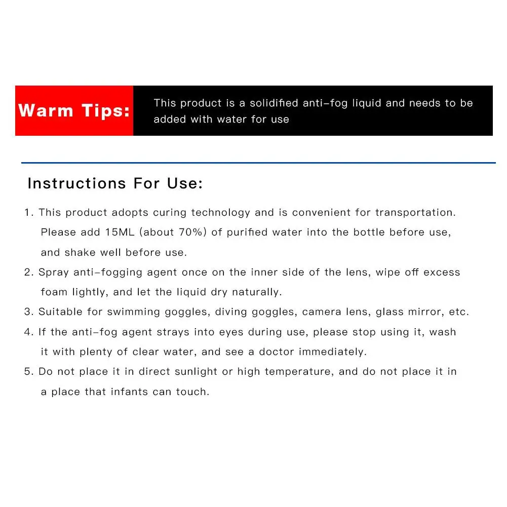 Дефоггер твердотельный Анти-туман агент для плавания очки стеклянные линзы маски для дайвинга очиститель раствор анти запотевание спрей туман 20 мл Точки пули: 1. Простота в использовании: Этот продукт использует технологию отверждения и удобен для транспортировки. Перед использованием добавьте в бутылку 15 мл (около 70%) очищенной воды и встряхните перед использованием. 2. Эффективная защита от запотевания: Распылите Средство против запотевания один раз на внутренней стороне линзы, слегка протрите излишки пены и дайте жидкости высохнуть естественным образом. 3. Широкое Применение: подходит для плавания, дайвинга, объектива камеры, стеклянного зеркала и т. д. 4. Примечания: Если Противо-туманный агент проникает в глаза во время использования, пожалуйста, прекратите использовать его, постирайте его с большим количеством чистой воды и немедленно обратитесь к врачу. 5. Советы по хранению: не размещайте его под прямыми солнечными лучами или при высокой температуре и не размещайте его в месте, где младенцы могут прикоснуться. Параметры: Название: твердая антизапотевающая жидкость Использование: спрей дизайн Размеры (Прибл.): диаметр: 2,5 см/0,98 дюймов, высота: 9,4 см/3,7 в Емкость: 20 мл Полезные советы: Этот продукт является затвердевшей противотуманной жидкостью и должен быть добавлен с водой для использования. Список: Твердый антизапотевающий агент * 1