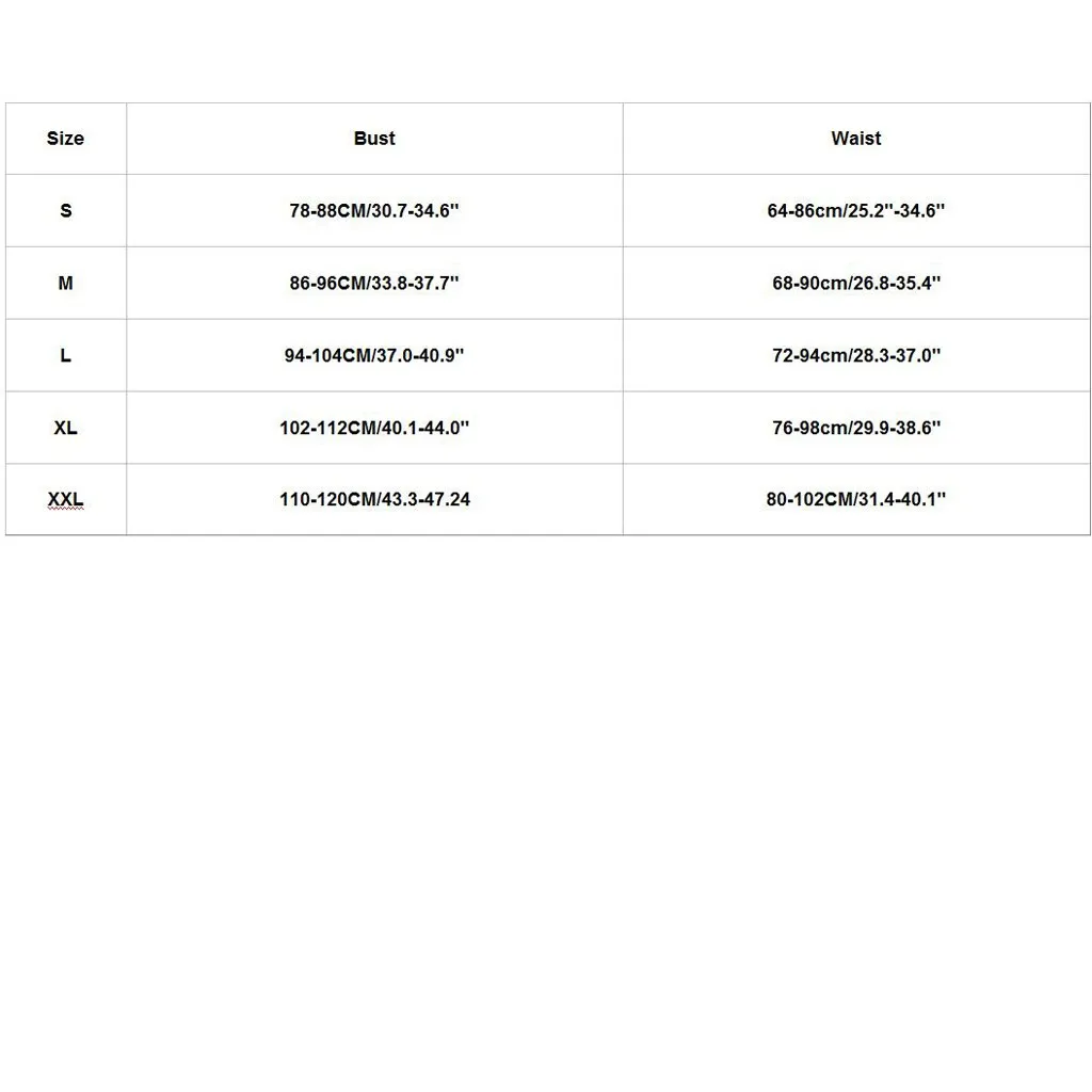 Размеры: S Бюст: 78-88 см/30,7-34,6" Талия: 64-86 см/25,2 "-34,6" Размеры: М Бюст: 86-96 см/33,8-37,7" Талия: 68-90 см/26,8-35,4" Размеры: L Бюст: 94-104 см/37,0-40,9" Талия: 72-94 см/28,3-37,0 дюйма Размеры: XL Бюст: 102-112 см/40,1-44,0" Талия: 76-98 см/29,9-38,6 дюйма Размеры: XXL Обхват груди: 110-120 см/43,3-47,24 Талия: 80-102 см/31,4-40,1"