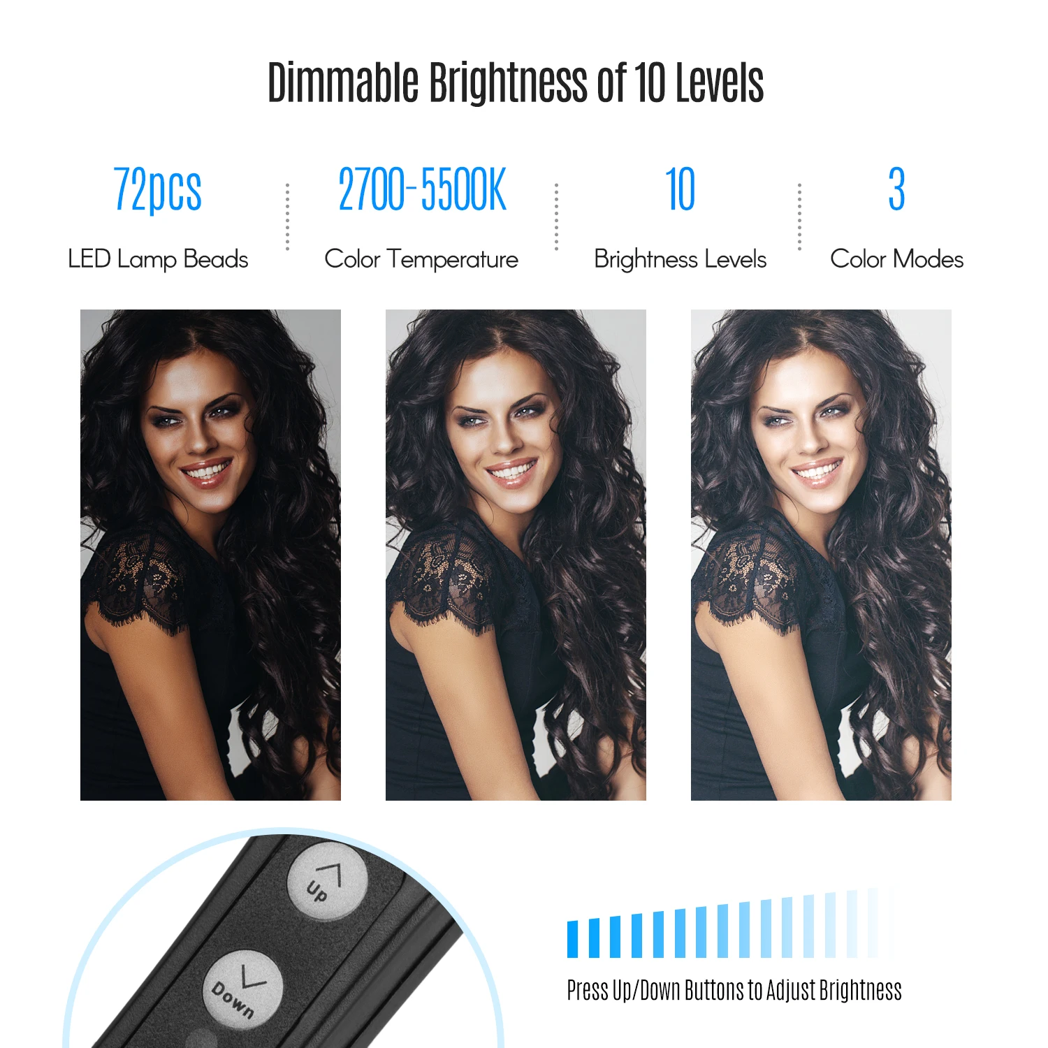 Кольцевой светильник имеет 3 вида цветов светильник режимов и 10 Регулируемая яркость для того, чтобы удовлетворить все ваши потребности в различных условиях. Кольцеобразный дизайн, который может создавать очаровательные огни во время портретной фотографии.