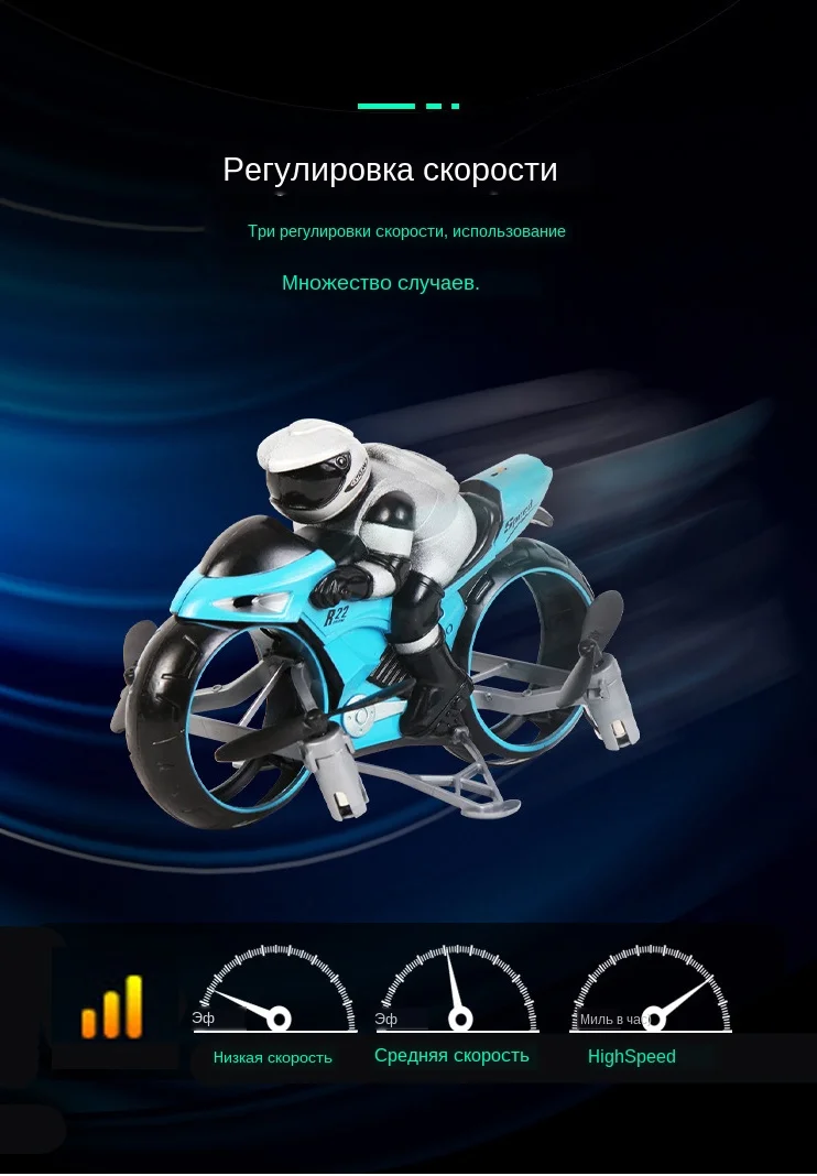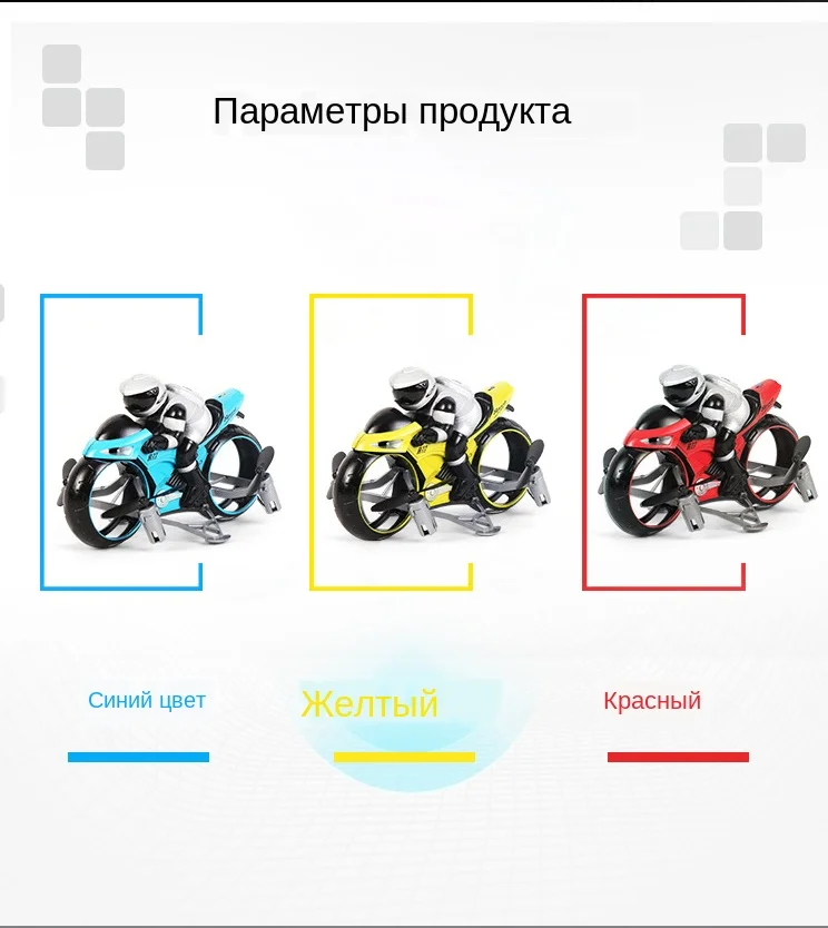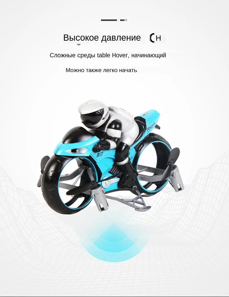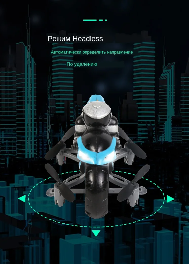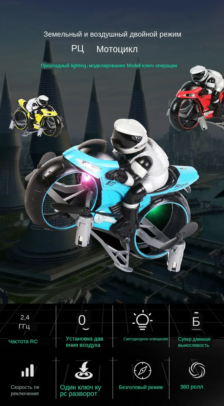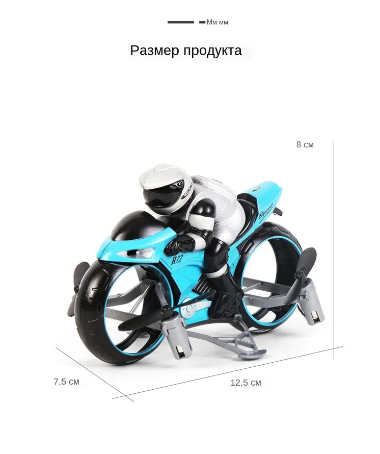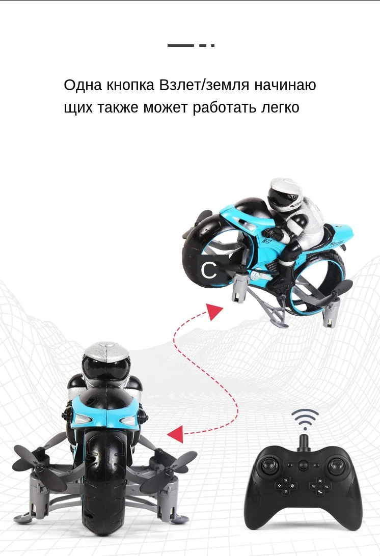 Пункты маркированного списка ---------- 1. Двойной Режим управления: пульт дистанционного управления мотоциклом разработан с наземным режимом И воздушный режим с помощью однокнопочного переключения, простой и быстрый, обеспечивая вам удивительный опыт использования. 2. Регулируемая скорость: пульт дистанционного управления мотоциклом имеет регулируемую скорость для удовлетворения различных потребностей, Легкий, прочный в конструкции и устойчив к падению, обеспечивая вашу безопасность. 3. Несколько функций: пульт дистанционного управления мотоциклом оснащен одной кнопкой взлета/посадки, Вверх/вниз, вперед/назад, поворот влево/вправо, левая/правая сторона fly и 360 градусов флип функции, Предоставление нескольких способов игры. 4. Длительное использование: пульт дистанционного управления мотоциклом оснащен перезаряжаемой батареей, Стабильный и легкий с интегрированным корпусом, устойчивый к падению и столкновению, обеспечивая более длительное использование. 5. Широкое применение: пульт дистанционного управления мотоцикла разработан с 2,4G дистанционного управления, Позволяет многим людям играть одновременно без помех, подходит для поверхности воды, Грязь, снег и другие местности. Технические характеристики ---------- Вес тела: около 30 г Удаленная Батарея: 1,5 в 3 * AAA батареи (не включены) Корпус батареи: 3,7 в 280 мАч литиевая батарея Время зарядки: около 60 минут Время полета: около 4-6 минут Расстояние дистанционного управления: около 30-50 метров Функции: Взлет/посадка одной кнопкой, вверх/вниз, вперед/назад, поворот влево/вправо, левая/правая сторона мухи, 360 градусов флип, освещение, регулируемая скорость, наземный и воздушный двойной режим. Товарная накладная ---------- 1 * usb кабель для зарядки 2 * лезвия 1 * Руководство пользователя 1*3,7 V 280 mAh литиевая батарея 1 * Дистанционное Управление