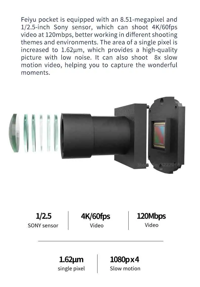 У нас есть feiyu pocket inkock сейчас, добро пожаловать, чтобы сделать заказ, тогда мы организуем его быстро. Спасибо за вашу помощь, любой вопрос, добро пожаловать к нам! Основные особенности: очень маленький и реальный карман, поэтому размер легко помещается в карман. Действительно маленький, но мощный. Вес только 115 г, светильник, как Gopro. Записывающее устройство Ultra HD 4K @ 60FPS, макс. скорость до 120 м, для создания реального видео 4k. Sony КМОП-матрица с 6 слоев, стеклянные линзы, до FOV 120 ゚and 1.62μm одного пикселя, легко получить ультра-широкий взгляд. Гибридная стабилизация с 6 осями поможет вам получить стабильные кадры HD. 1,3 "дюймовый Сенсорное управление для того, чтобы легко переключать режим работы и настройки камеры. Функция быстрого автофокуса с нулевой задержкой, возможность съемки в любое время. Со всех режимами следования 360 ° POV и 2 видами основных режимов следования, а также макс. скорость до 180 °/С позволяет быстро отслеживать, как вы хотите. Статический/Трековый timelapse/Hyperlapse, несколько режимов auto-panorama и max. 8x медленное движение для достижения интеллектуального способа съемки. Подключите приложение к Wi-Fi, чтобы получить видеозапись в режиме реального времени и дистанционное управление. Интеллектуальная функция синхронизации движения на основе приложения, она работает с вашей рукой и получает то, что вы хотите. Встроенный в режим красоты фото помогает вам легко улучшить красоты и поделиться им на ходу. Оснащенный простым/традиционным китайским/английским/японским/чешским, предлагает более удобный опыт использования в различных областях (обновит больше языков позже). Чрезвычайно Долгое время работы от аккумулятора до 4,5 часов, работая с макс. Хранение 512 г до держится пол дня или даже больше. С отверстием для резьбы 1/4 дюйма внизу, это позволяет вам приспосабливать больше аксессуаров. Экран дисплея: 1,3 дюймов/IPS/240*240 передачи и хранения: 2,4 ГГц WI-FI, ширина ремешка: 20 МГц, оптимальное расстояние составляет 5 м, а максимальная. На расстоянии 10 м.