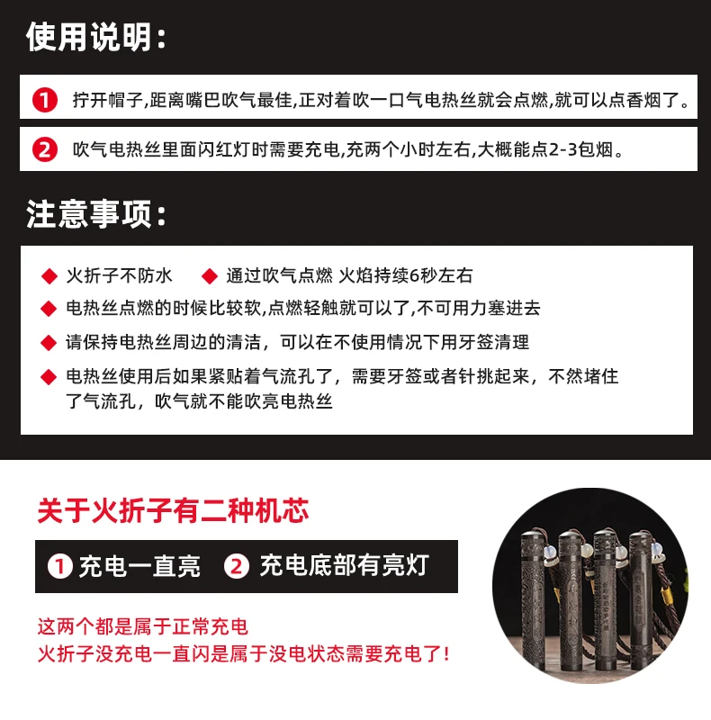 Пожарный выключатель не является водонепроницаемым Зажгите воздухом, пламя длится около 6 секунд Нагревательный провод мягкий, когда он зажигается, просто светильник и прикоснитесь к нему. Пожалуйста, держите периферию нагревательного провода чистой, вы можете очистить его зубочисткой, не используя его Если нагревательный провод близок к отверстию воздушного потока после использования, вам нужно забрать его с помощью зубочистки или иглы, В противном случае отверстие воздушного потока будет заблокировано, и нагревательный провод не может быть продан.