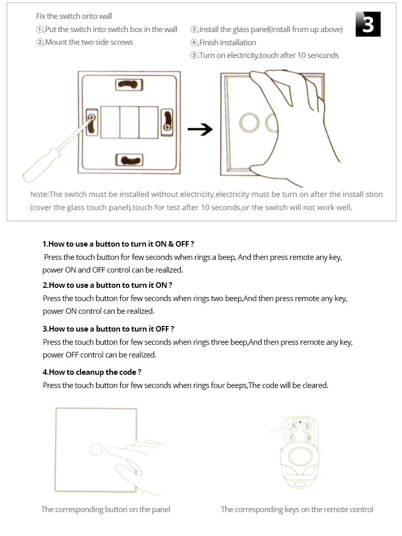 Закаленное стекло панели, не выцветает, элегантный и стильный дизайн интегрированной панели, водонепроницаемый и анти-ползучий, безопасное использование сенсорного управления обеспечивает более длительный срок службы, чем механический переключатель, новый импортный Процессор IC для хорошей чувствительности и стабильной производительности гуманизированный дизайн: Выключатель может автоматически отключаться при отключении электричества, и он будет находиться в отключенной станции, когда электричество вернется к использованию для товарных домов, вилл, отелей и т. д. Вся продукция производится по высоким стандартам и сертифицирована ЕС для использования в Великобритании, ЕС и других европейских странах